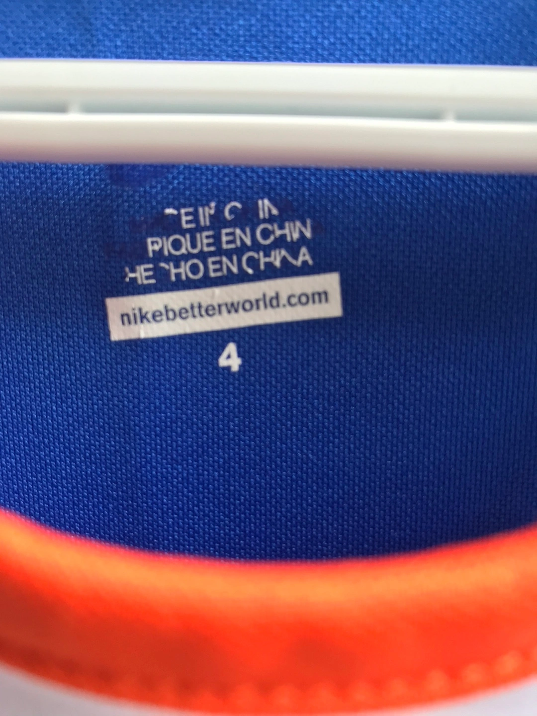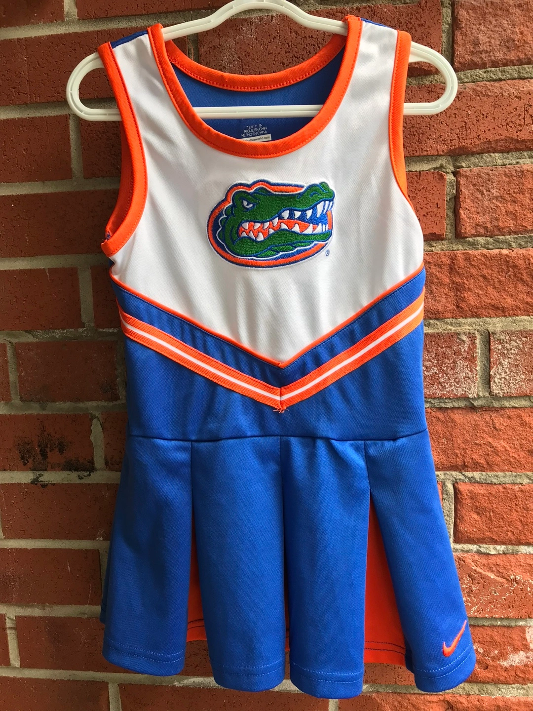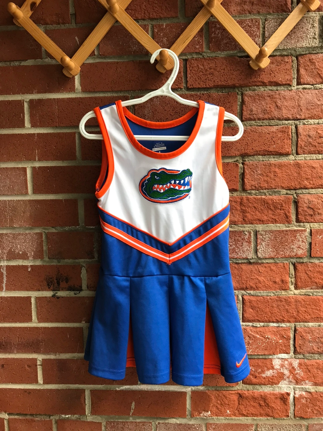 Cheerleader dress in blue, orange and white. Sleeveless, with a pleated skirt and a Gators logo.