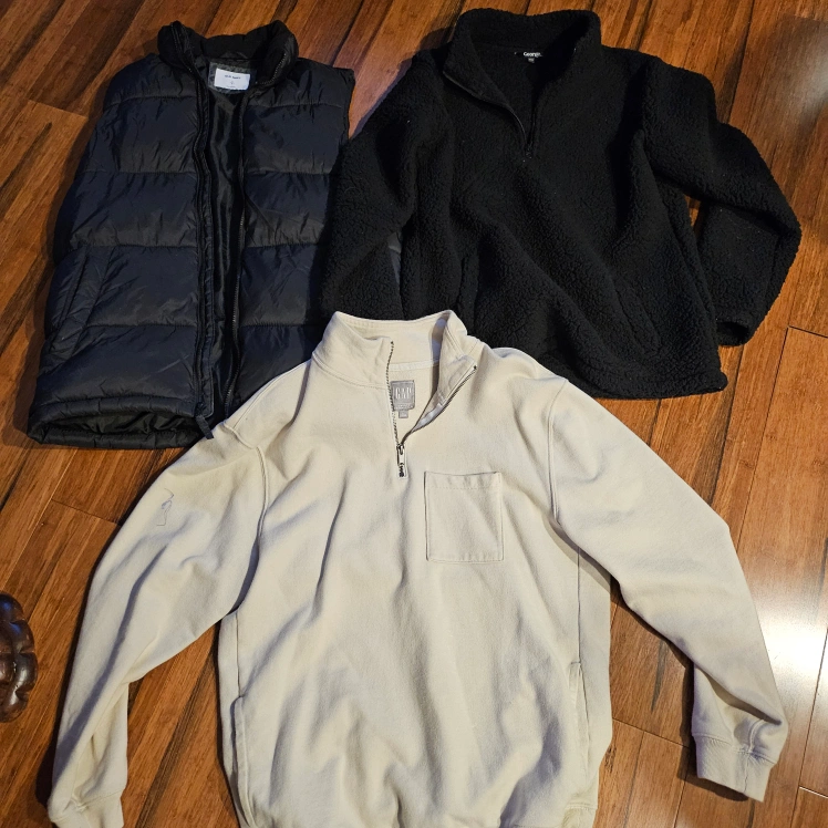 Bundle includes a GAP sweater cotton in kaki color, George fleece pullover and an Old Navy puffer vest. Both are black and in good condition.