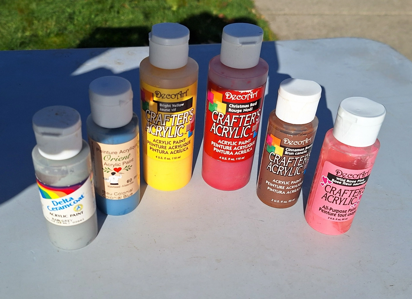 Six 2-ounce and 4-ounce DecoArt Crafter's Acrylic and Delta and Orient paint bottles. Includes blue, grey, yellow, red, brown and pink paint.