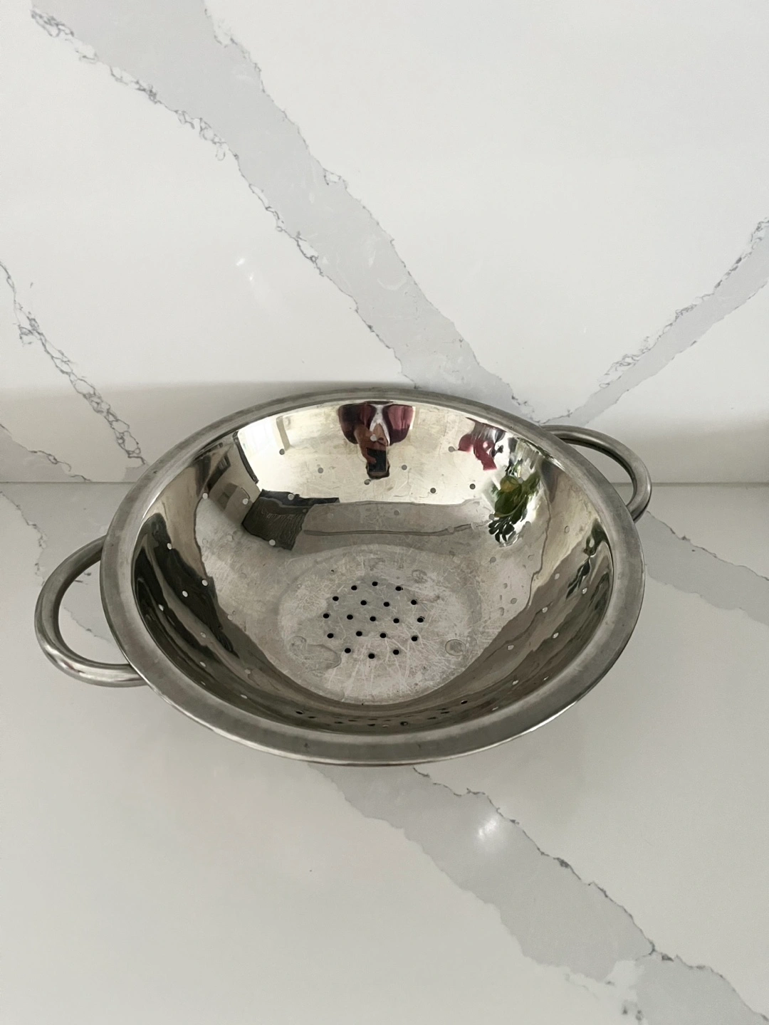 Stainless steel colander with two handles. Good for straining pasta, vegetables, and other foods. Don’t need more than 2 so hoping this one can find a new home.