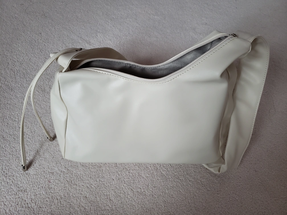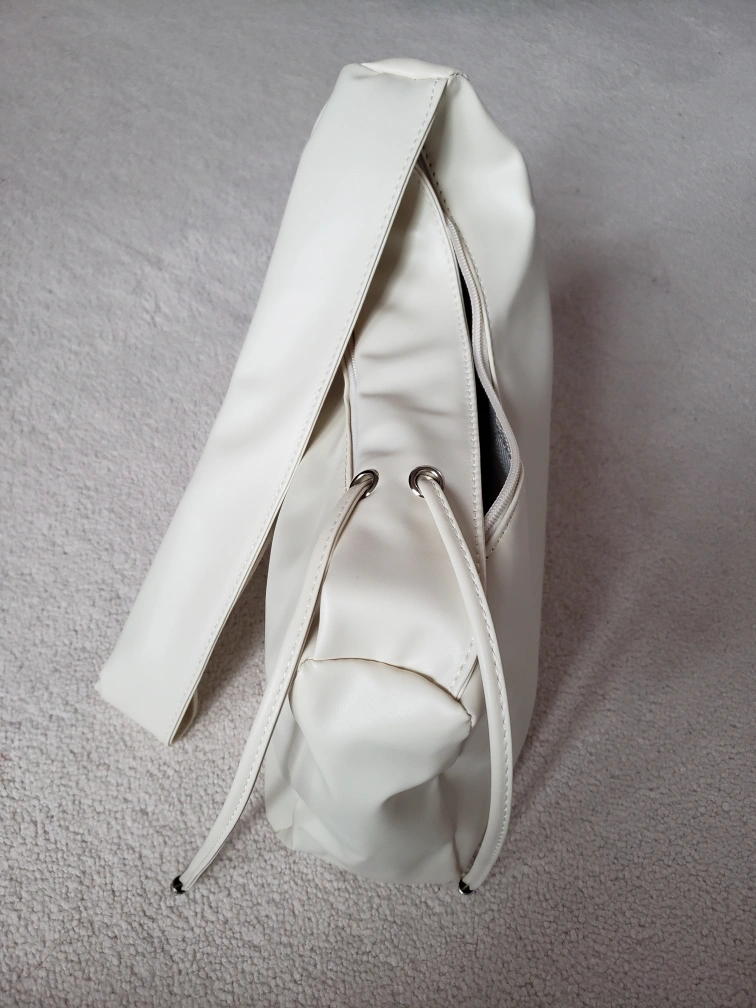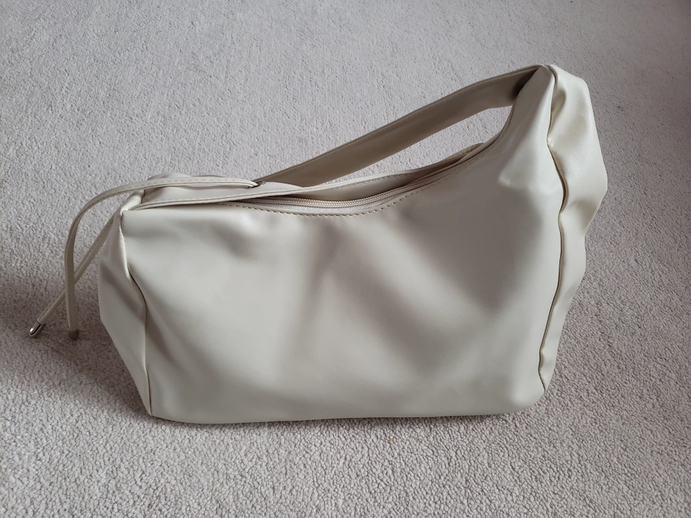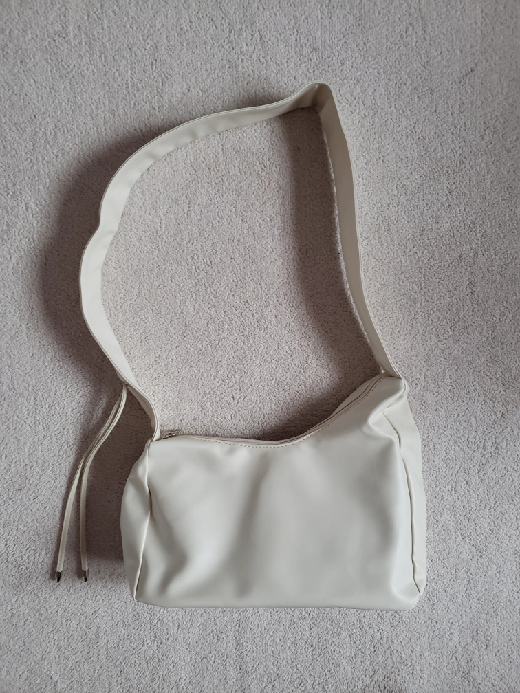 Selling an off-white shoulder bag with a long adjustable strap