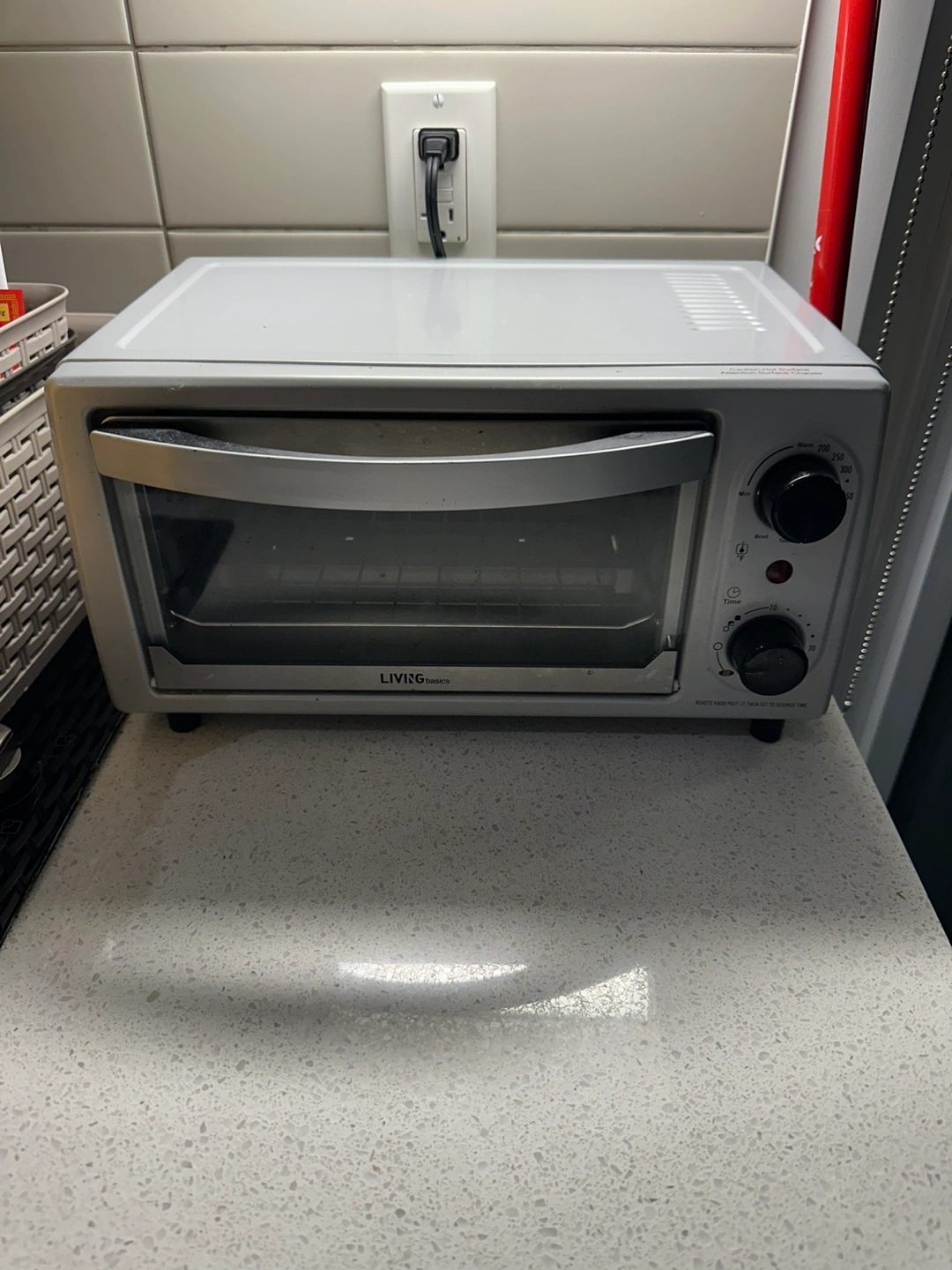 White toaster oven with glass door. Includes knobs for temperature control and timer.