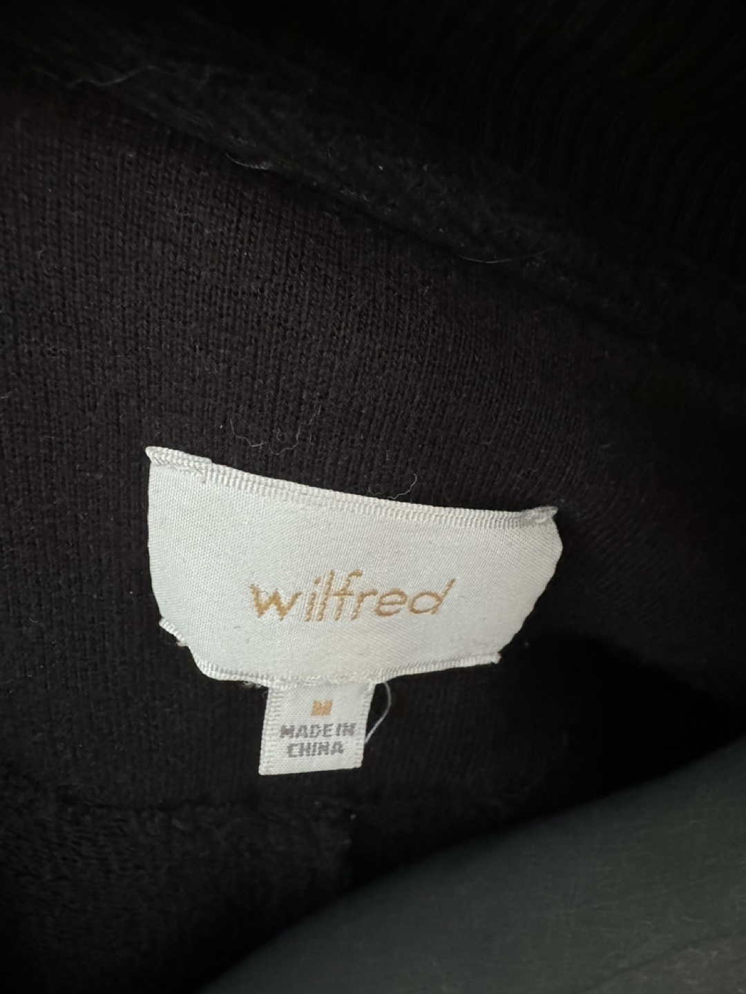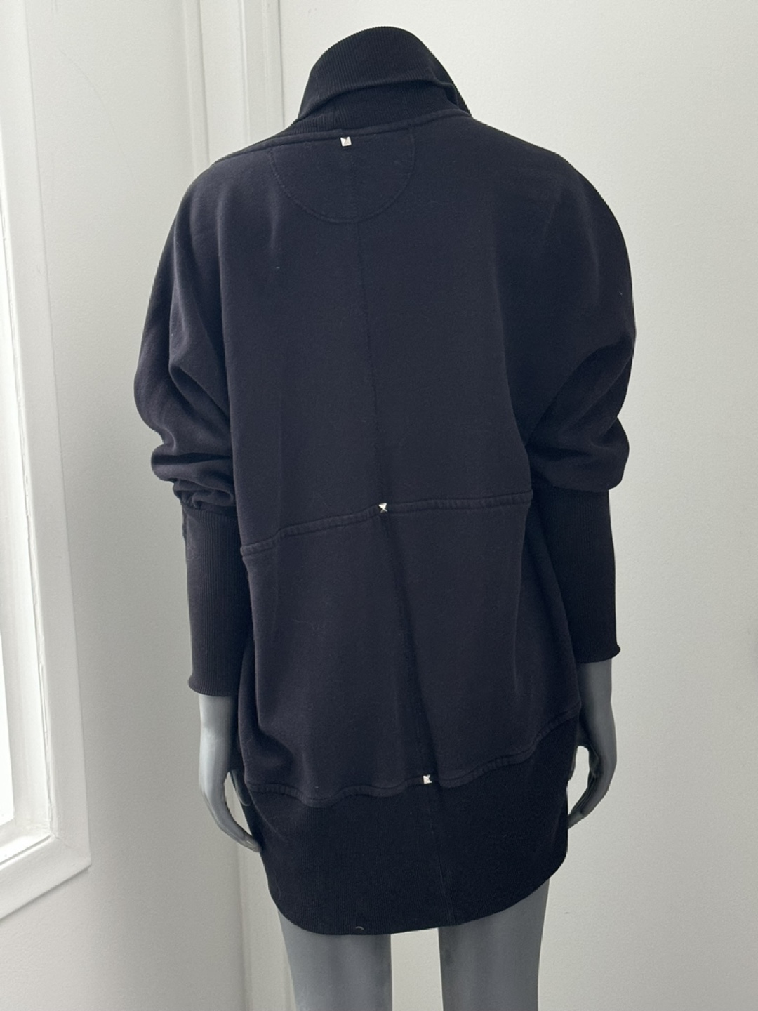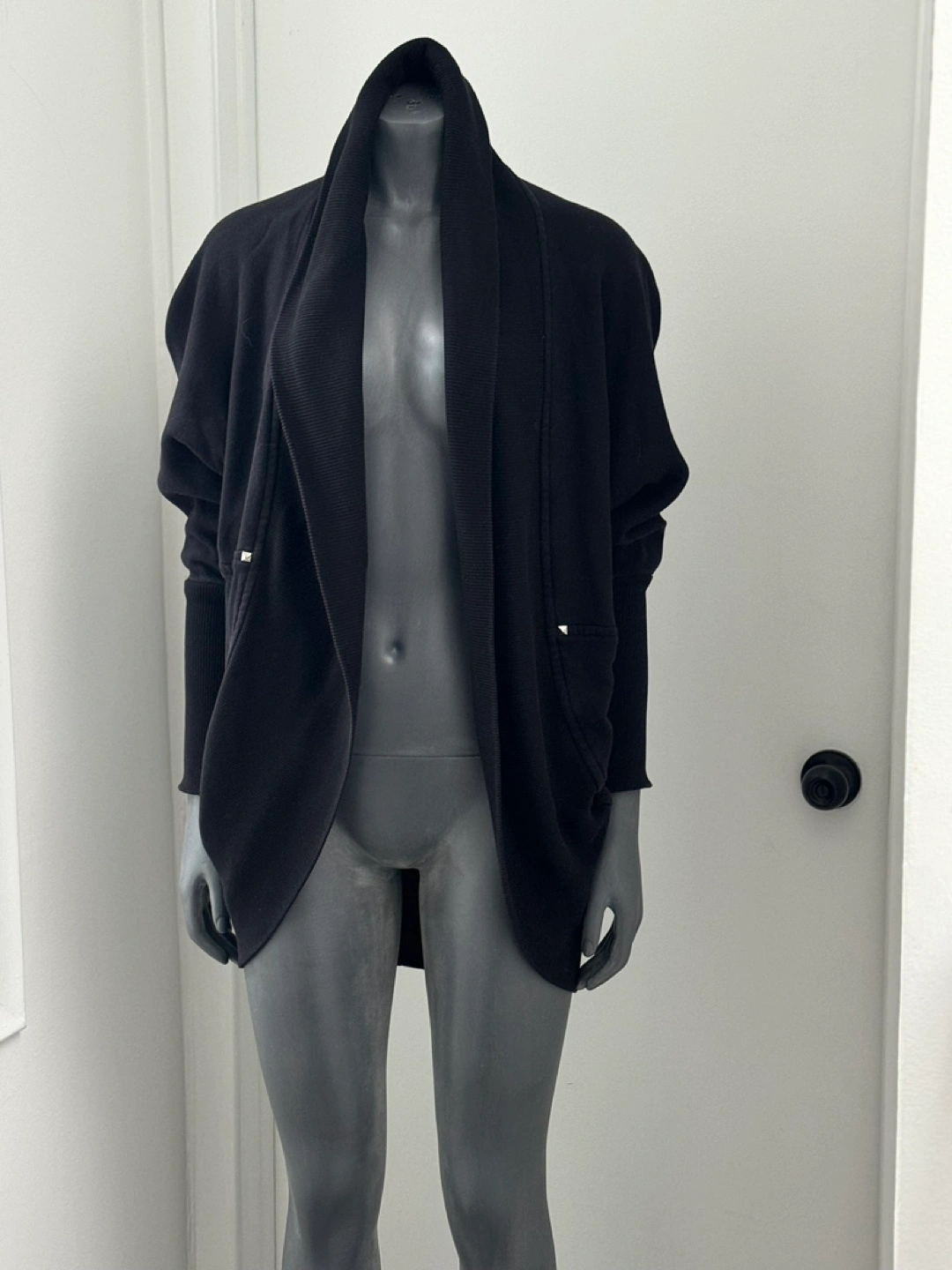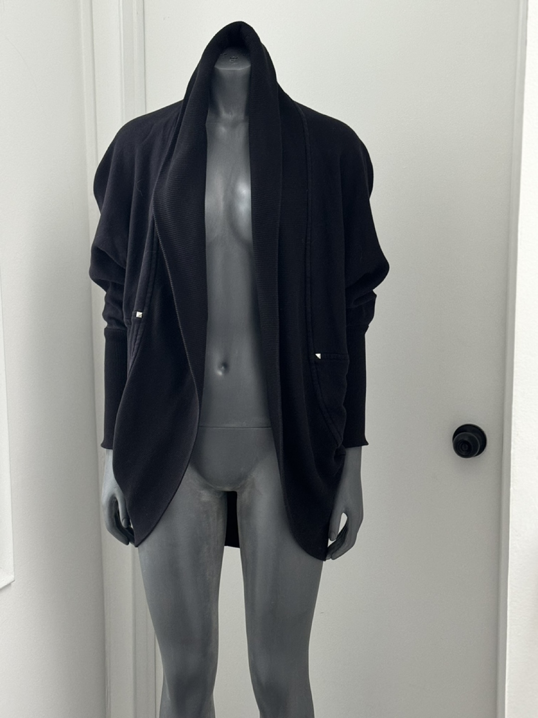 Long-sleeved black cardigan with a draped neckline. Has two front pockets and metal accents on the sleeves. 100% cotton. Worn once