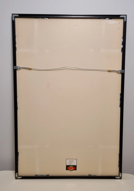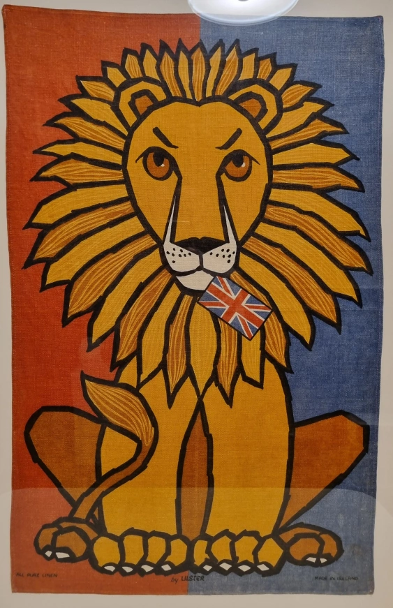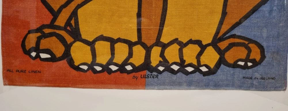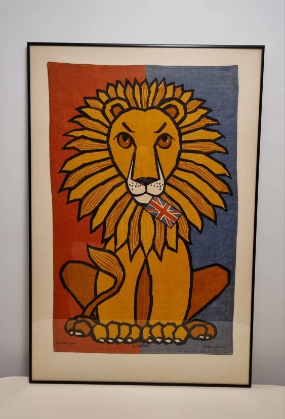 55Framed linen wall hanging featuring a lion with a Union Jack flag in its mouth. Made in Ireland. Size: 24" * 36"