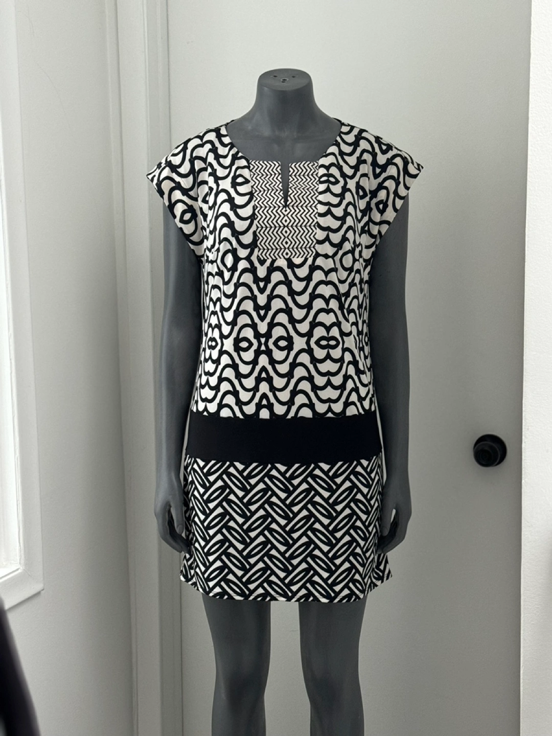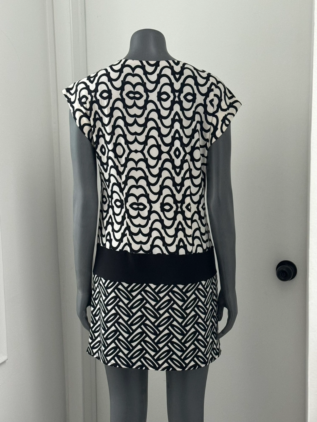 Black and white dress with geometric pattern. Short sleeves and a v-neck. Size Small. Never worn