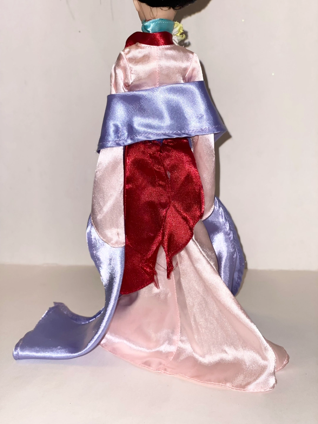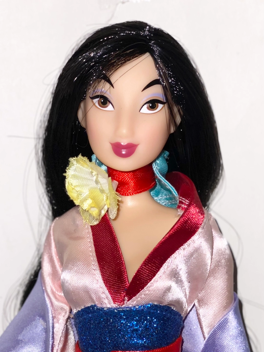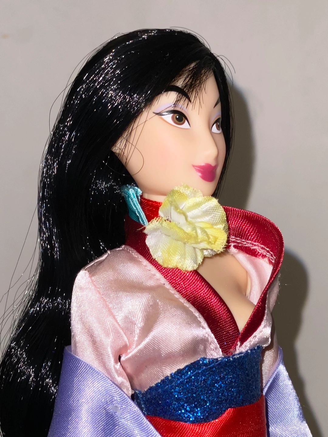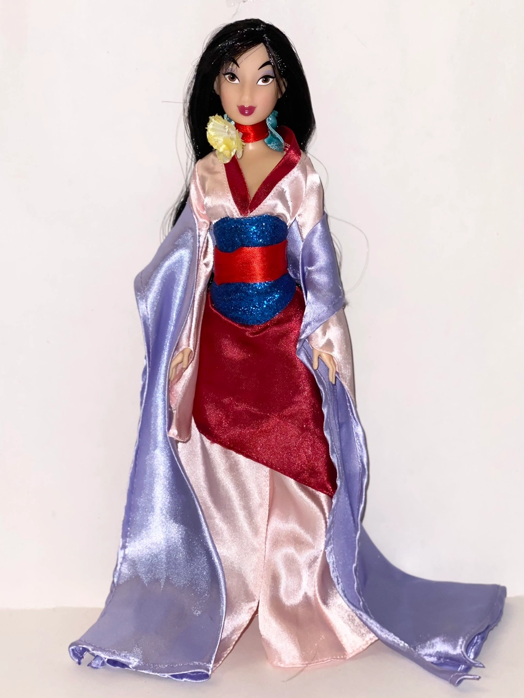 Mulan doll wearing a pink, red, and blue dress with a purple shawl. Long black hair with a yellow flower chocker. Wear and tear may be present. Measures at 11” tall.