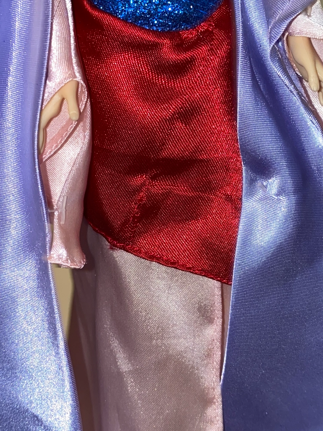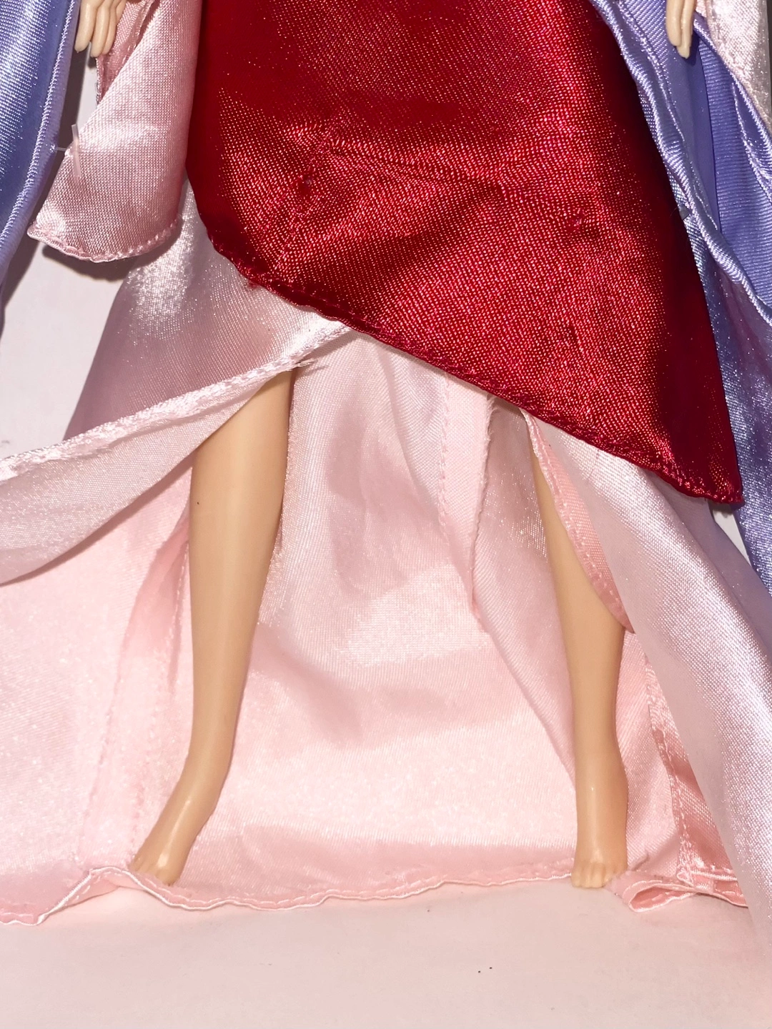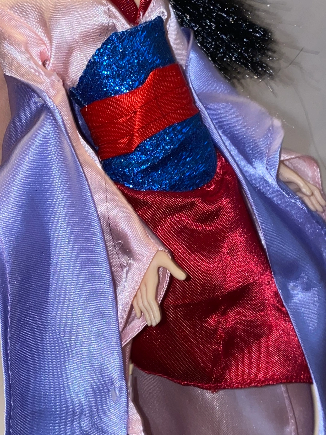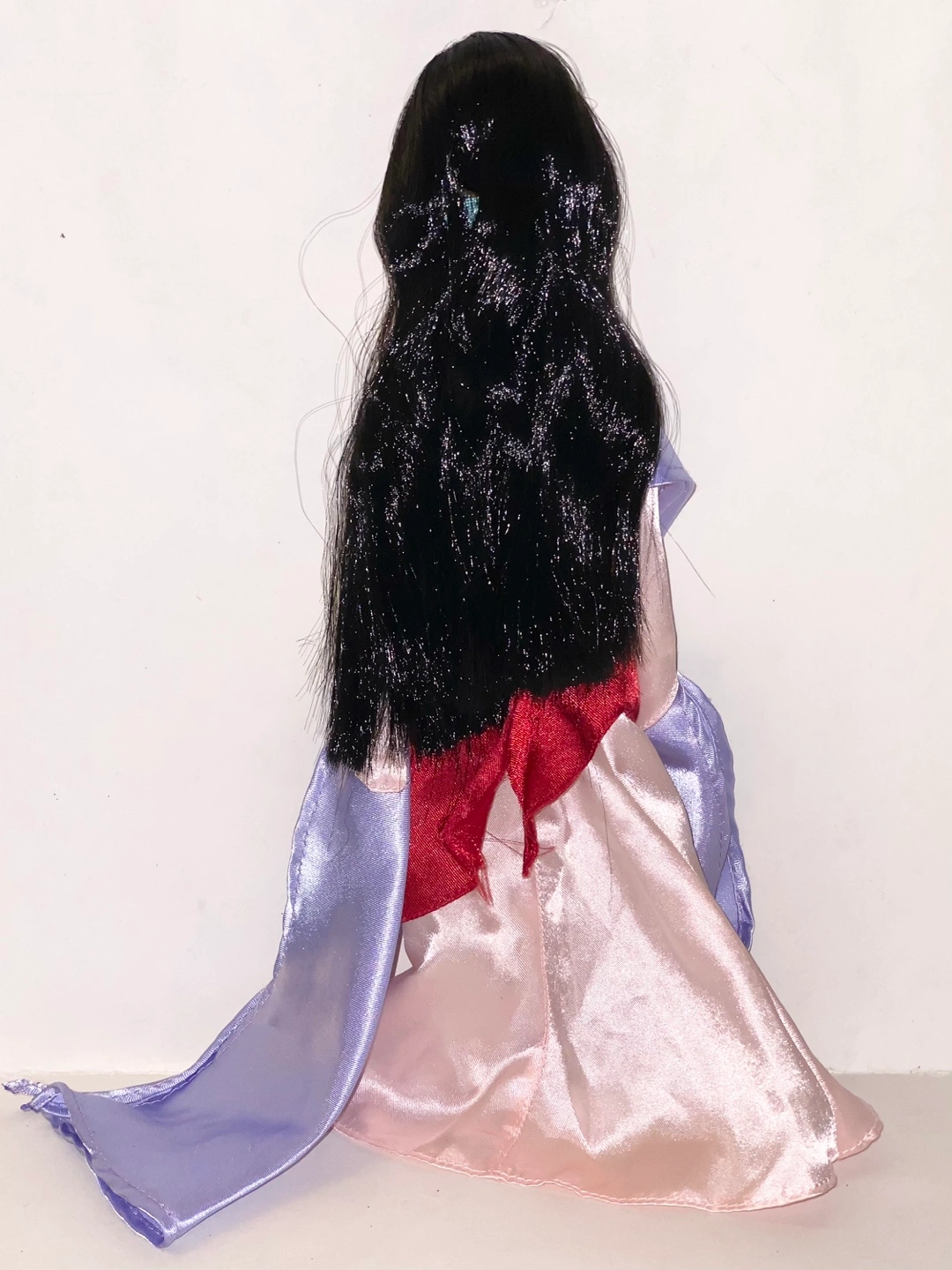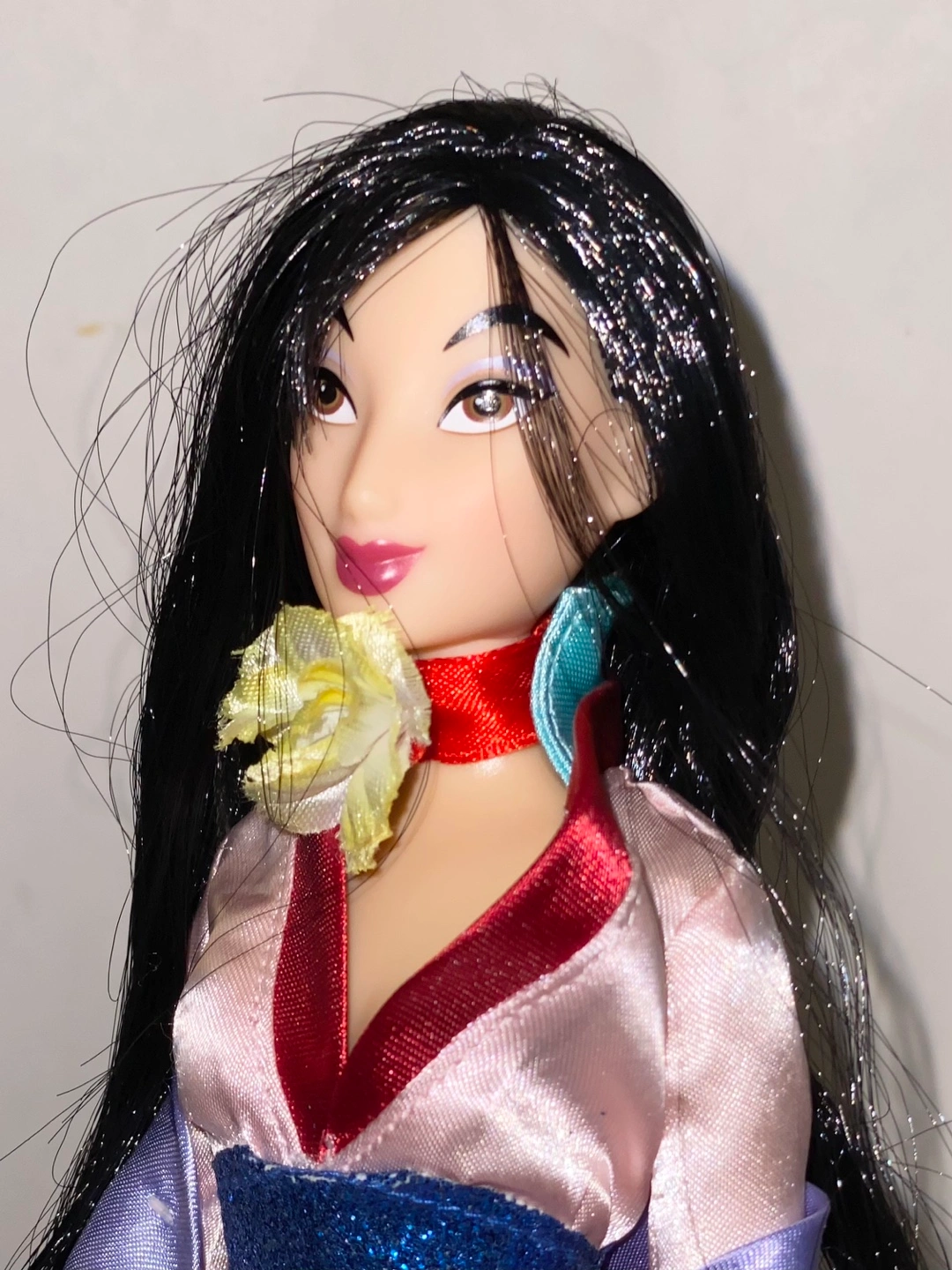 Mulan doll wearing a pink, red, and blue dress with a purple shawl. Long black hair with a yellow flower chocker. Wear and tear may be present. Measures at 11” tall.