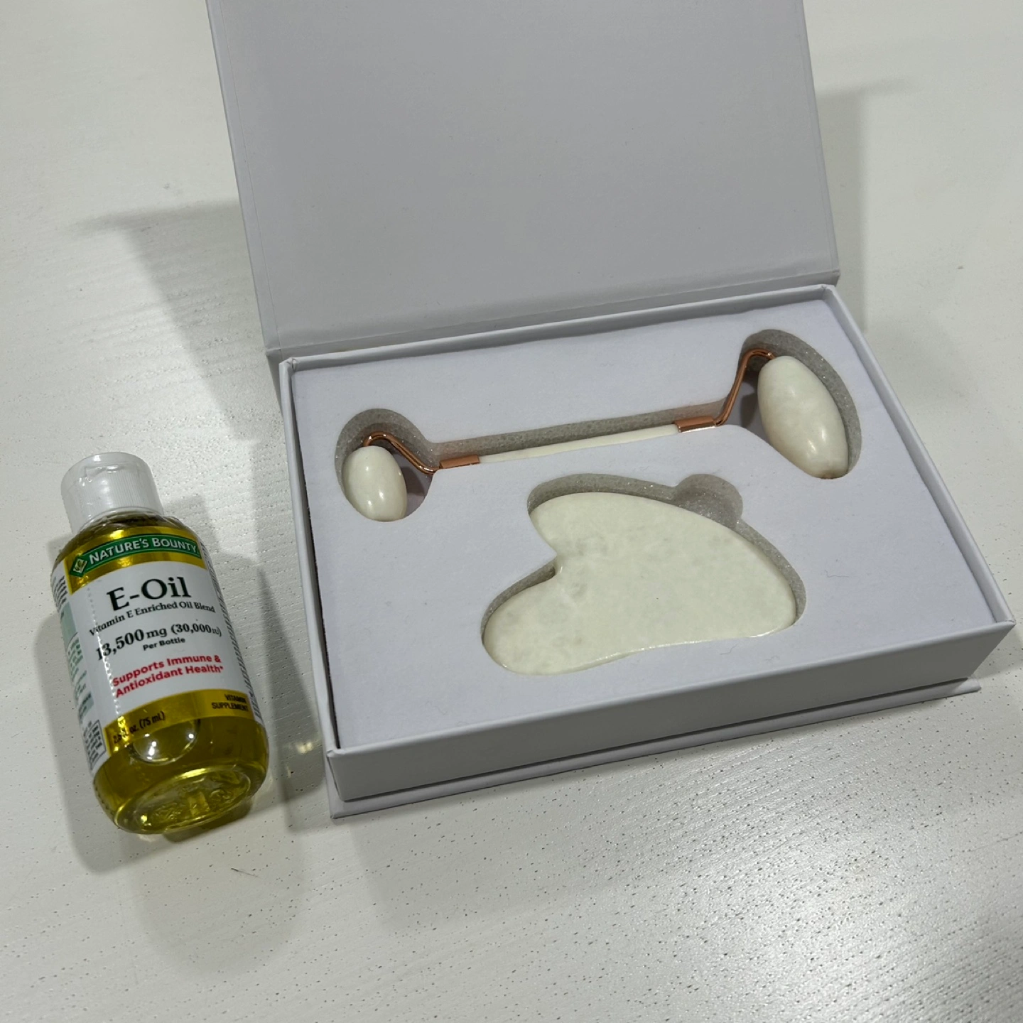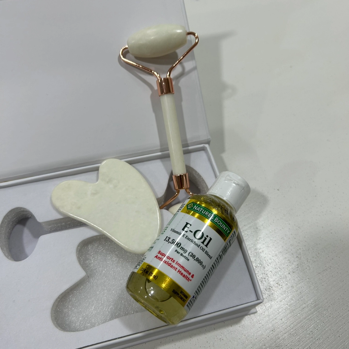 Facial roller and gua sha tool in a white gift box, includes a bottle of Nature's Bounty E-Oil.