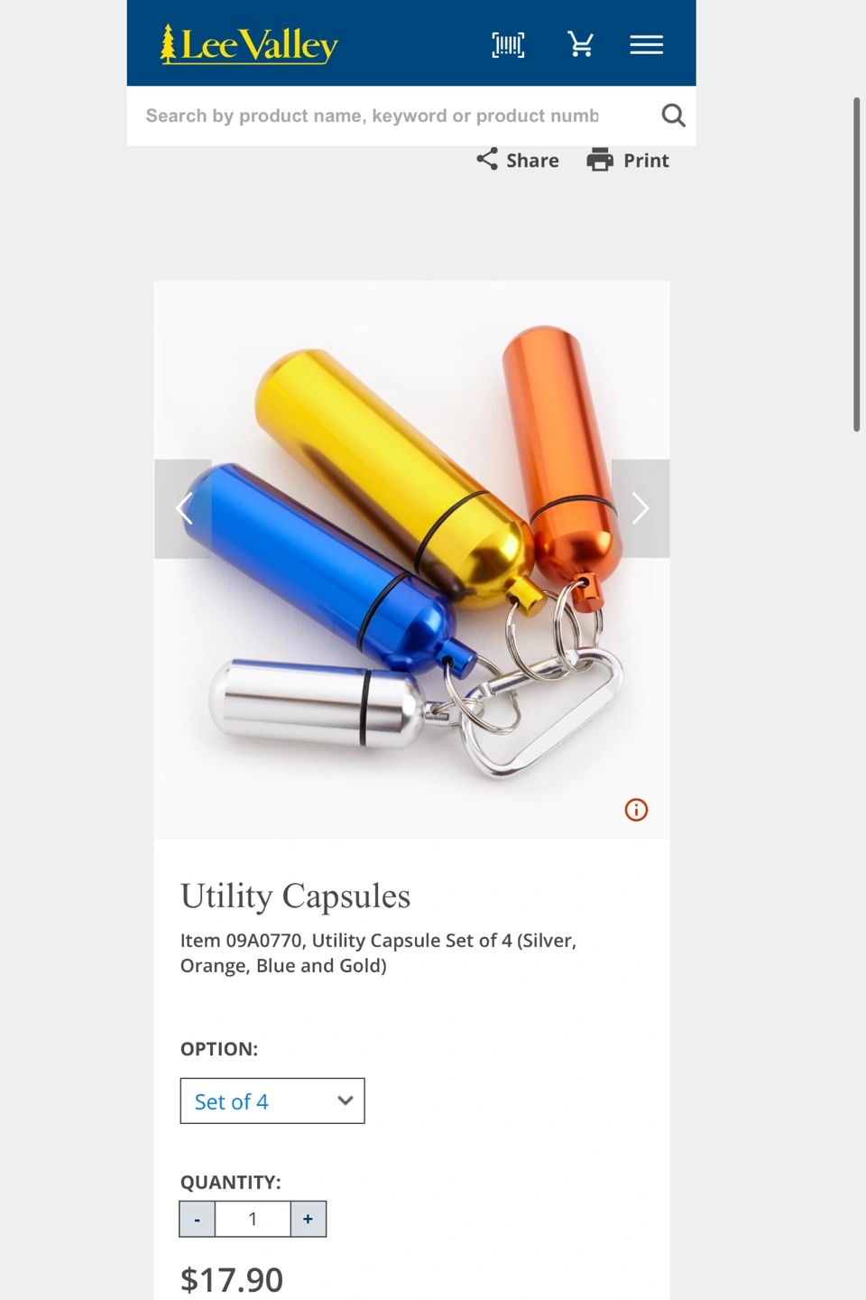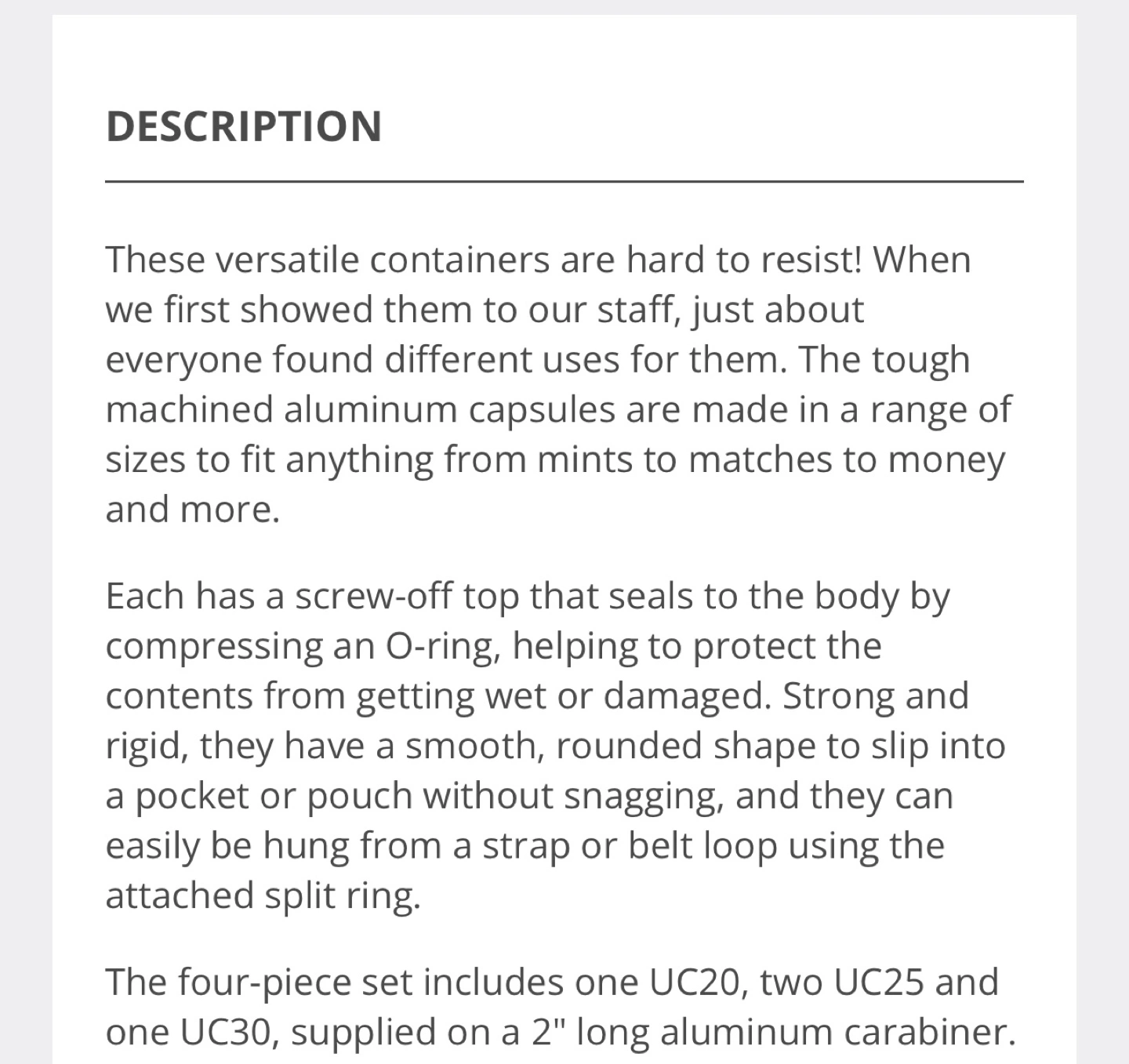 Set of 4 aluminum capsules with screw-off top, O-ring seal, and split ring. Includes one UC20, two UC25, and one UC30. Supplied on a 2 inch long aluminum carabiner. I removed the tag thinking I would use them but I never have. Very sturdy and well made.