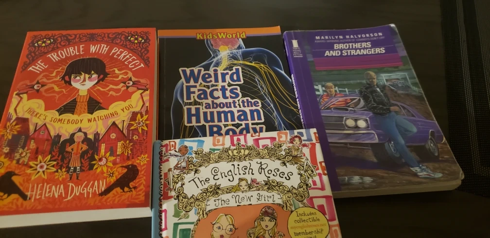 Titles include The Trouble with Perfect, Weird Facts about the Human Body, The English Roses, and Brothers and Strangers.