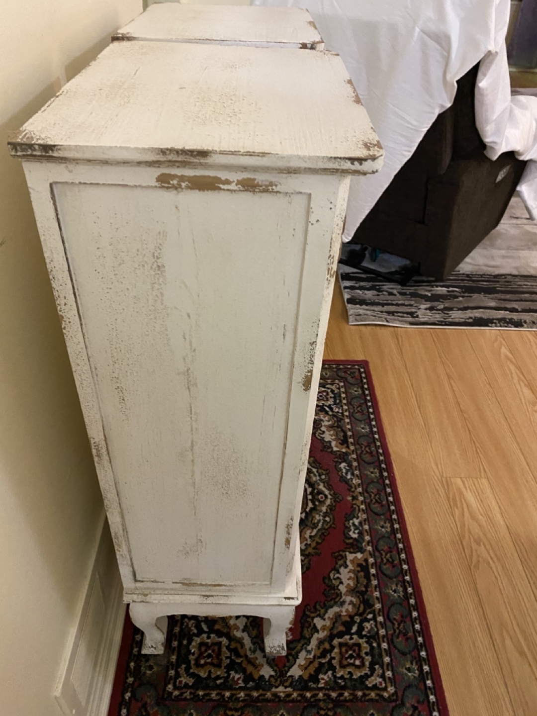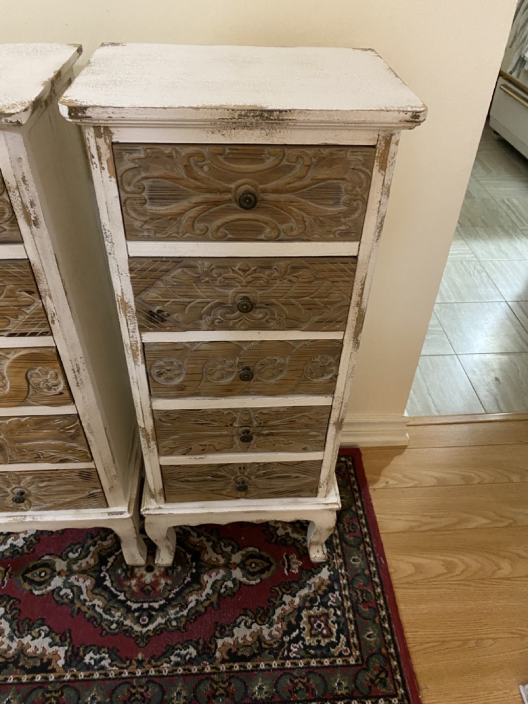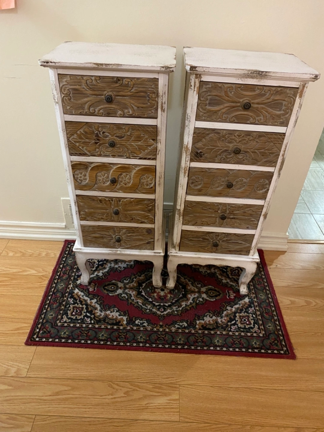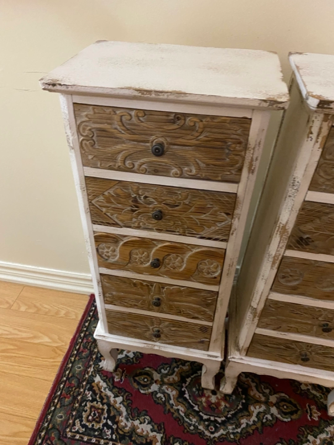Set of two white distressed wooden chests with five drawers each. Drawers are made of a light wood with carved details. The chests have decorative feet. Excellent condition