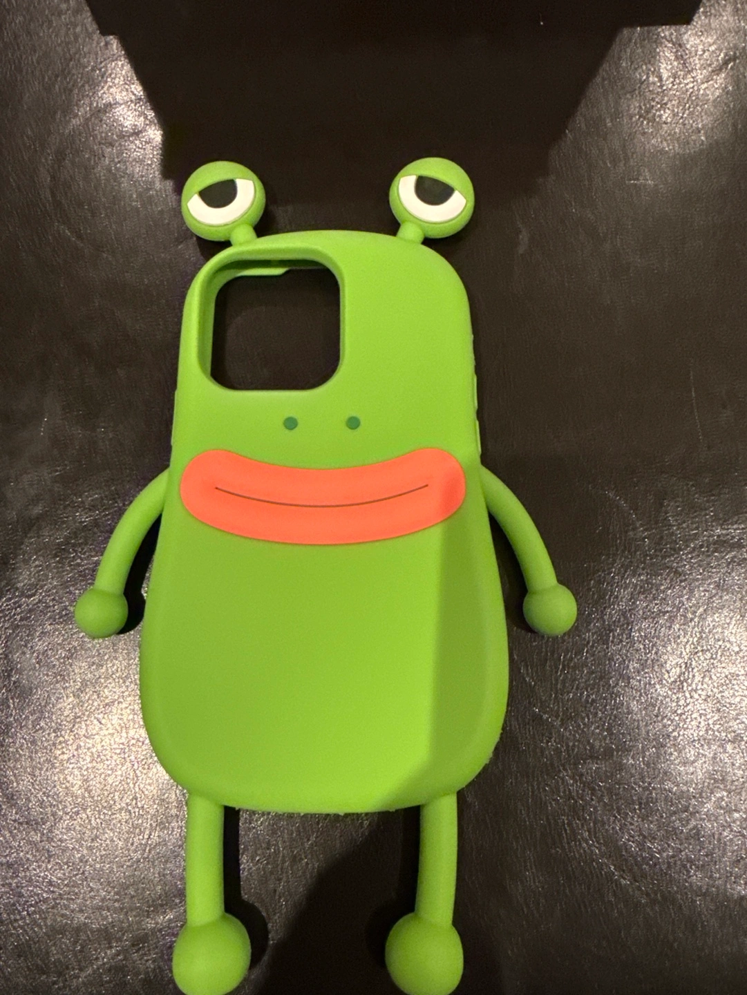 Green silicone phone case shaped like a frog. Has a raised frog face on the back. Suitable for iPhone 12 Pro Max.