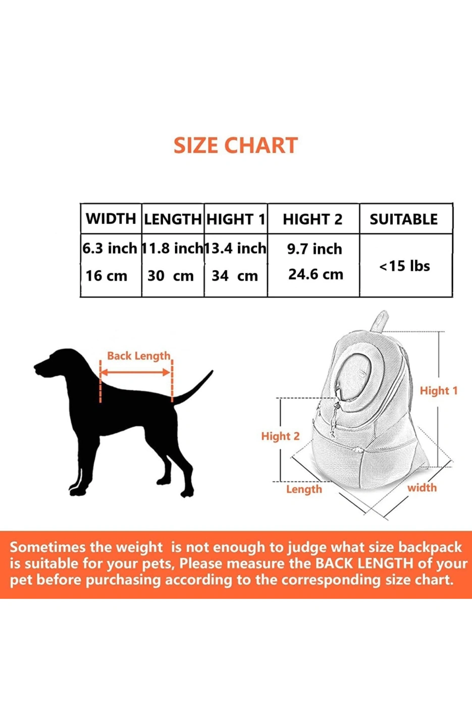 Recommended for Medium Dogs & Cats} doggy backpack carrier (11.8*6.3*13.4)inch is designed to carry small and medium-sized dogs/cats, and we highly recommend it for pets under 20LB (large dogs may be too much of a burden for their owners). Please measure your pet's BACK LENGTH and compare those measurements with the dimensions of our backpack.