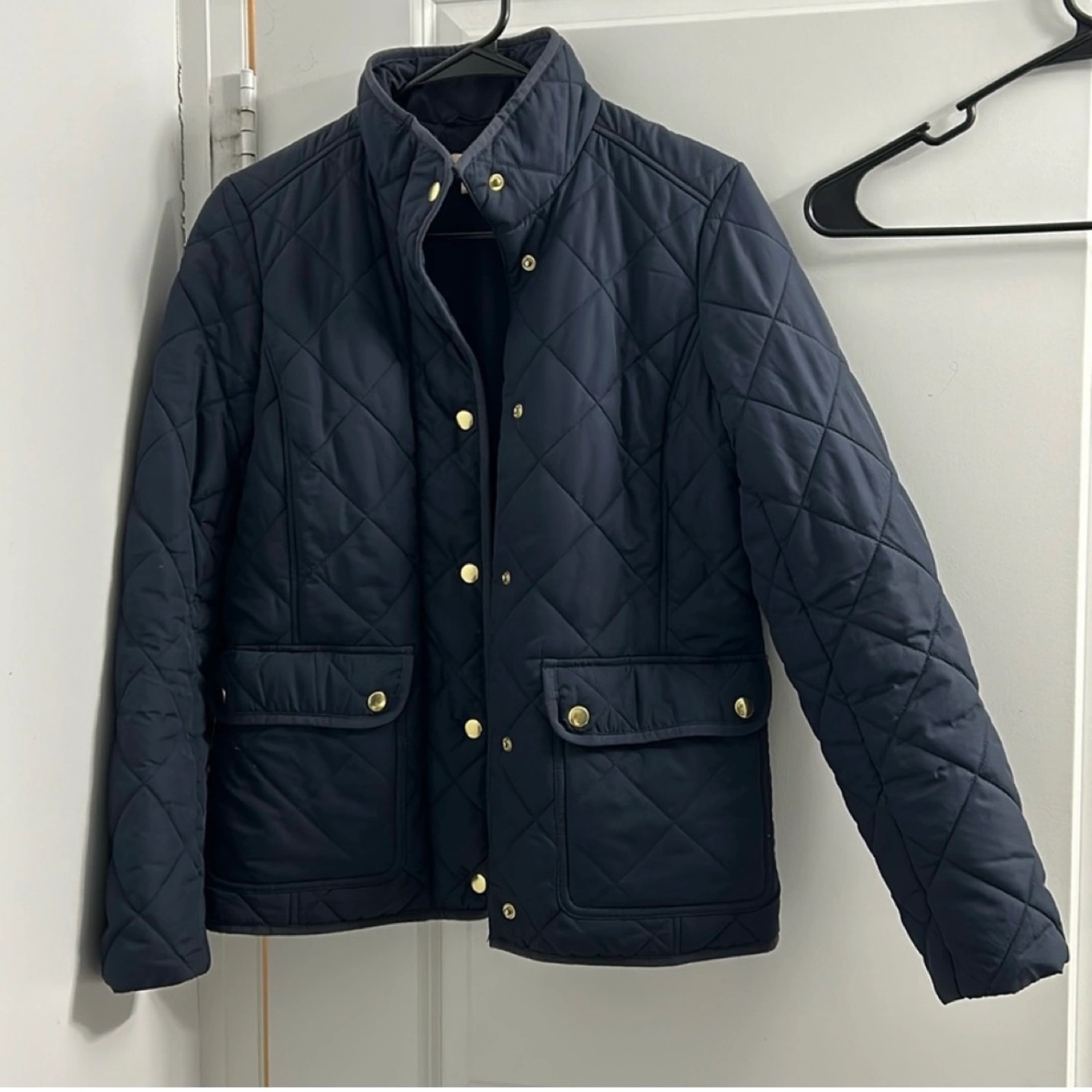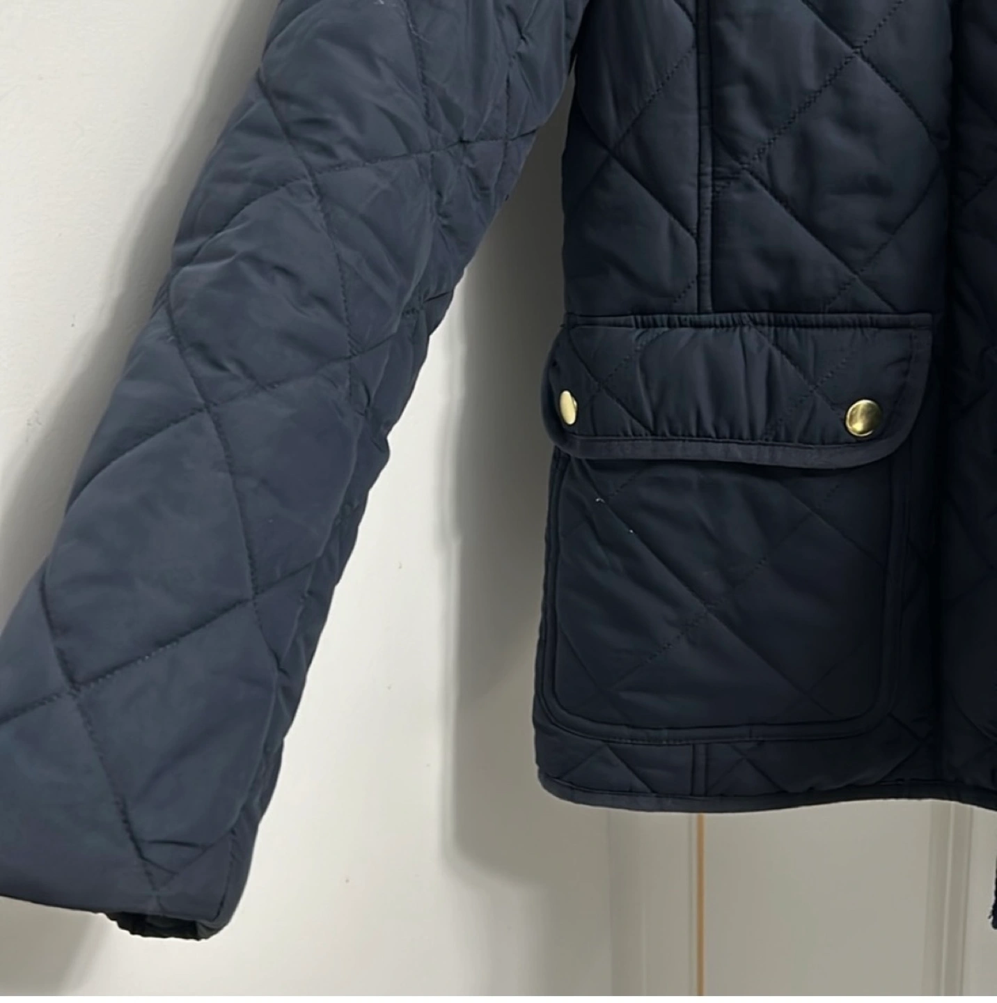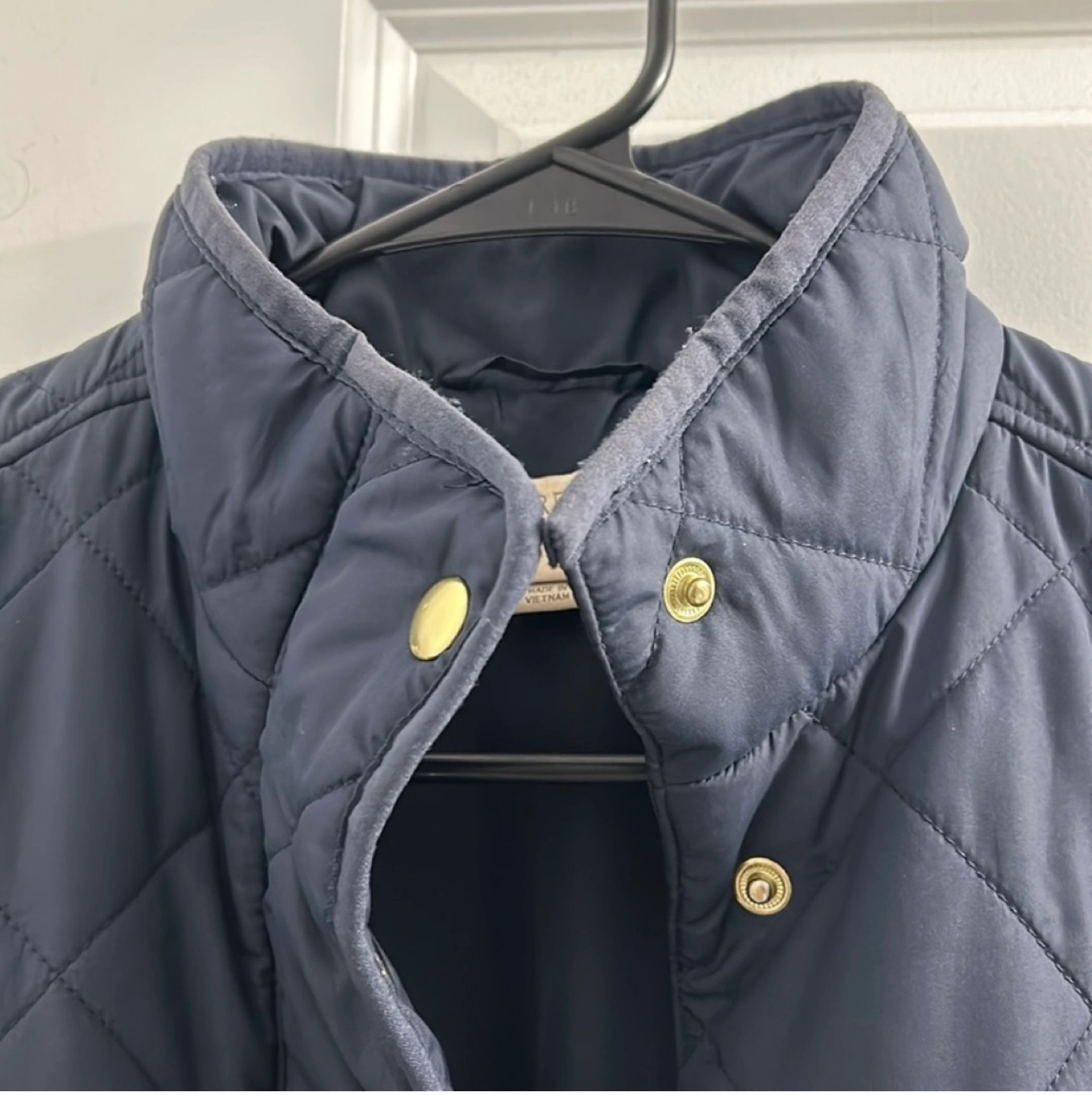 Navy blue quilted jacket. Gold buttons. Two front pockets. Long sleeves. It’s slightly frayed at the collar but the jacket is in great condition otherwise. Open to negotiation on the price.