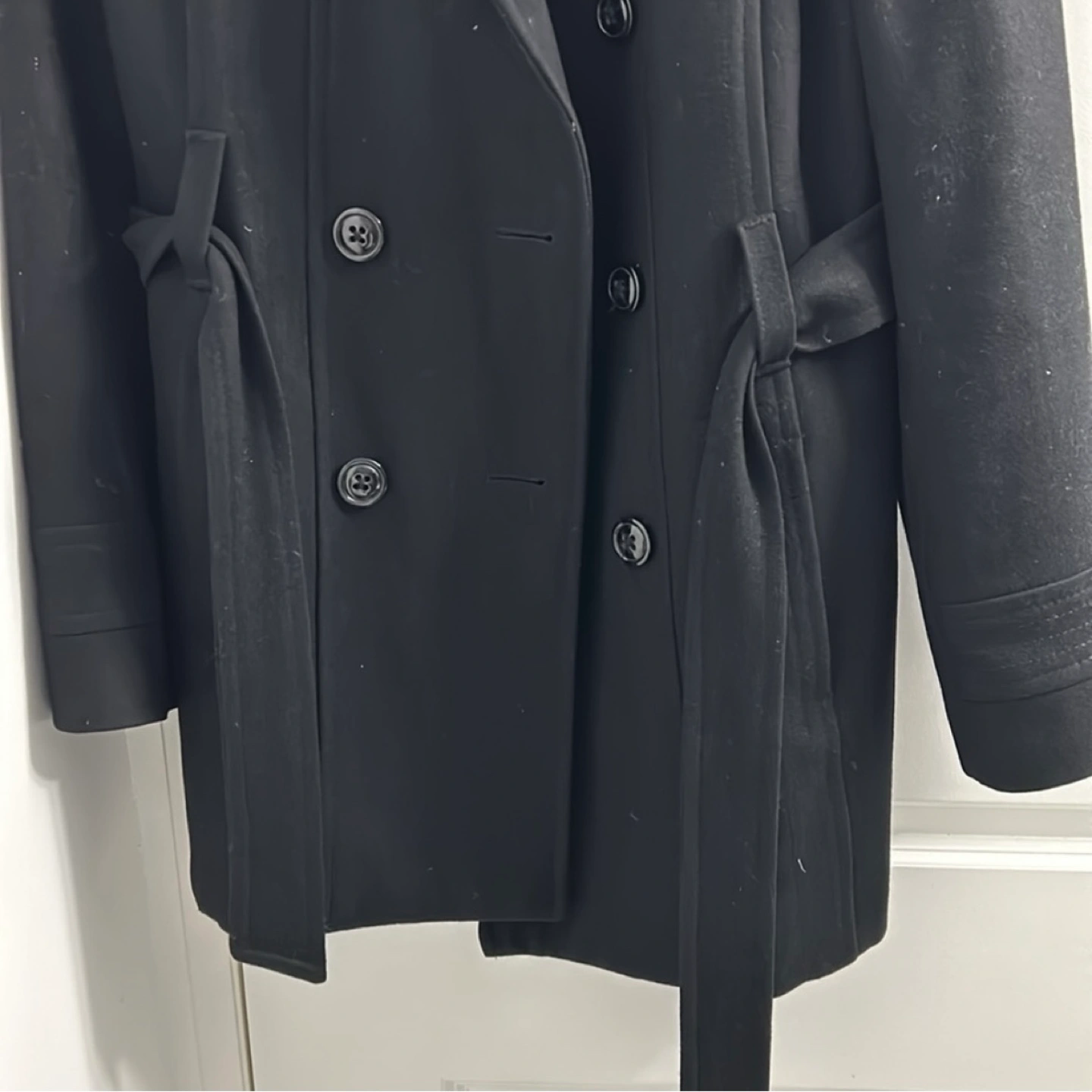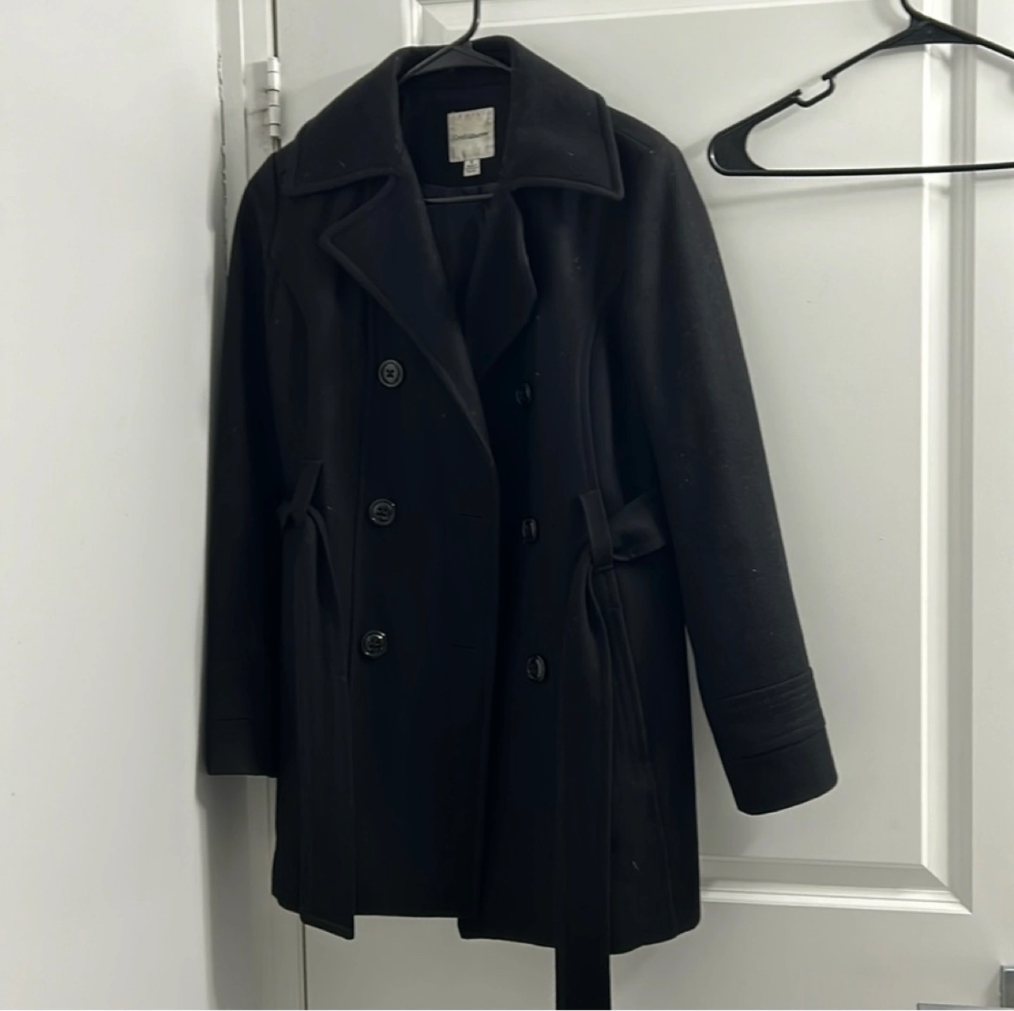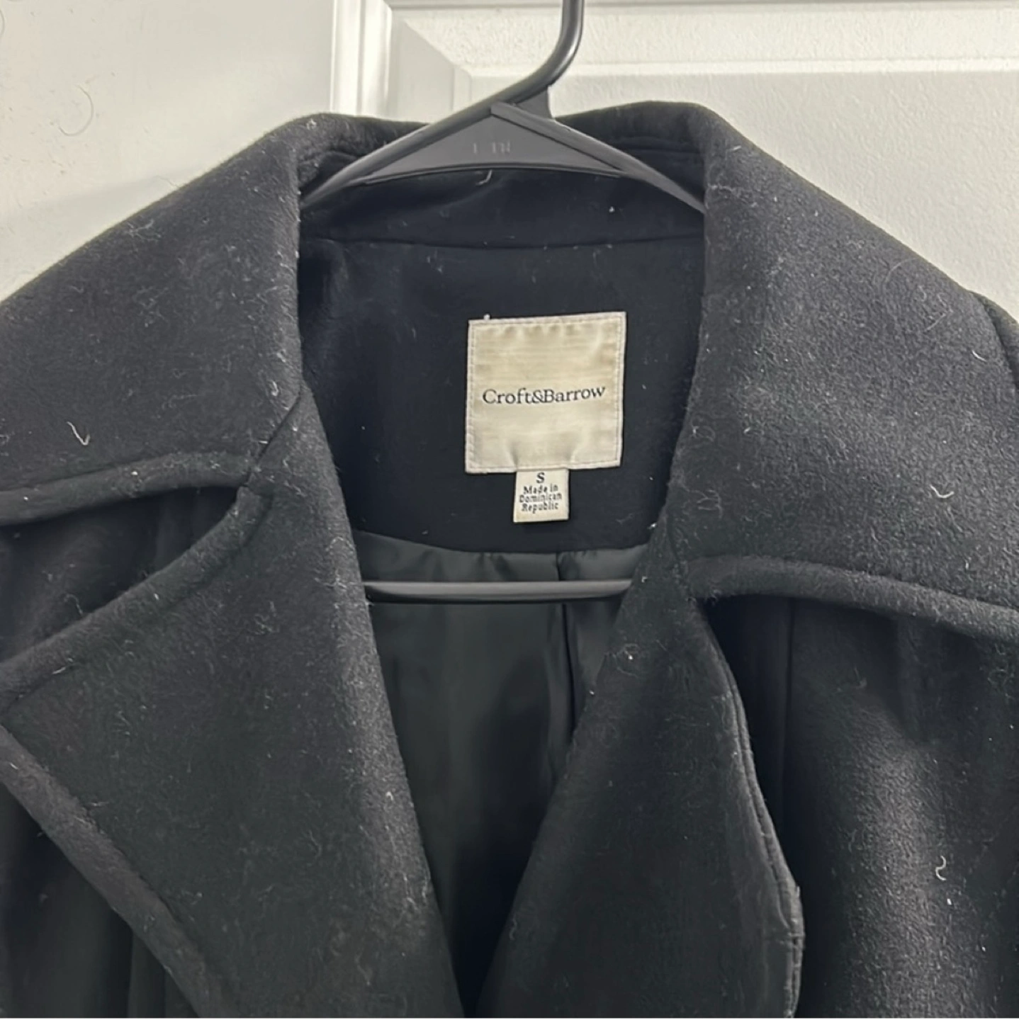 Croft and Barrow black wool blend peacoat in black. Has a tie belt and ends right above the knee (I’m 5’6). Lightly used but in great condition. Double breasted. Size Small.