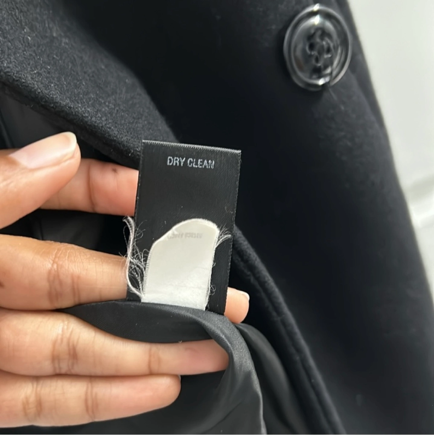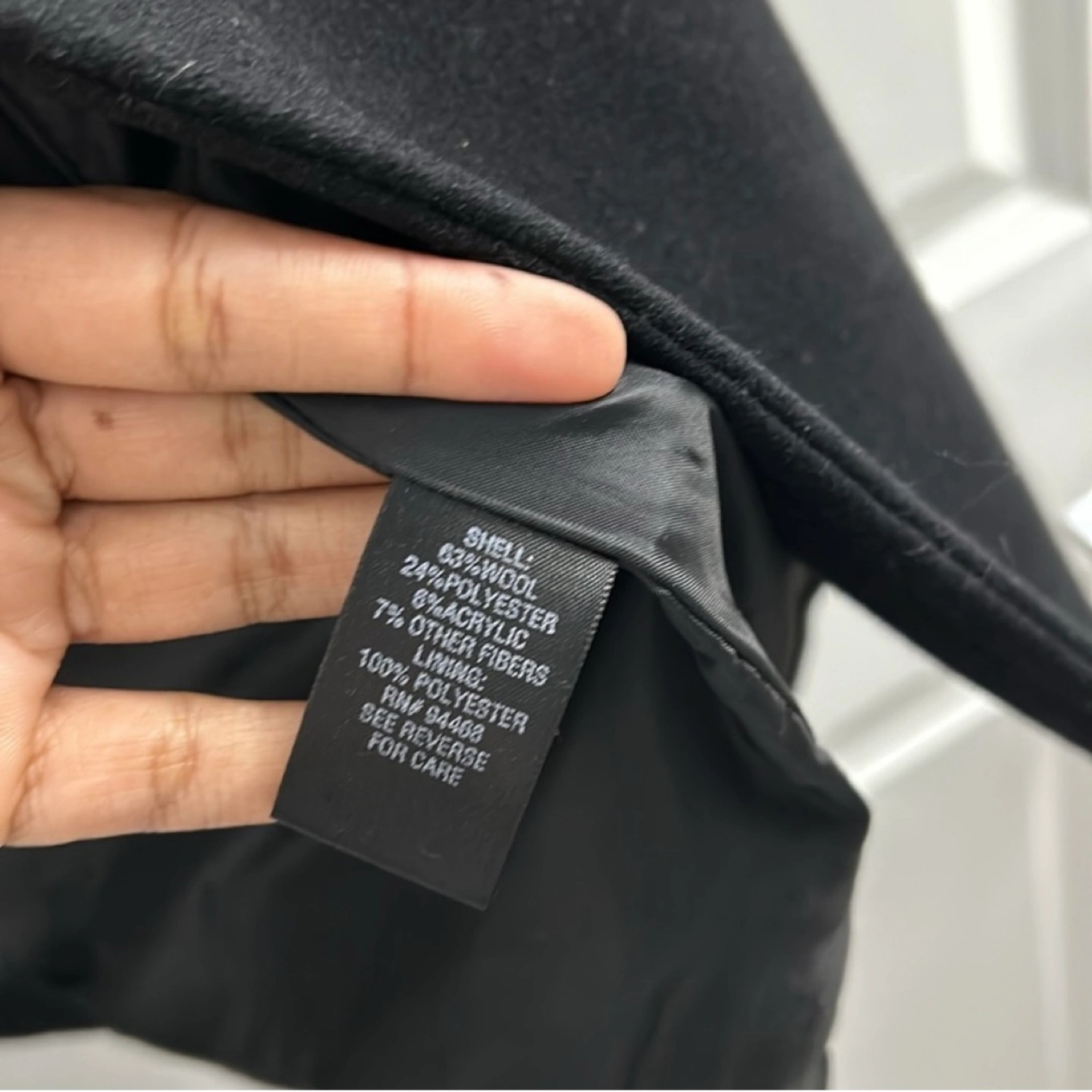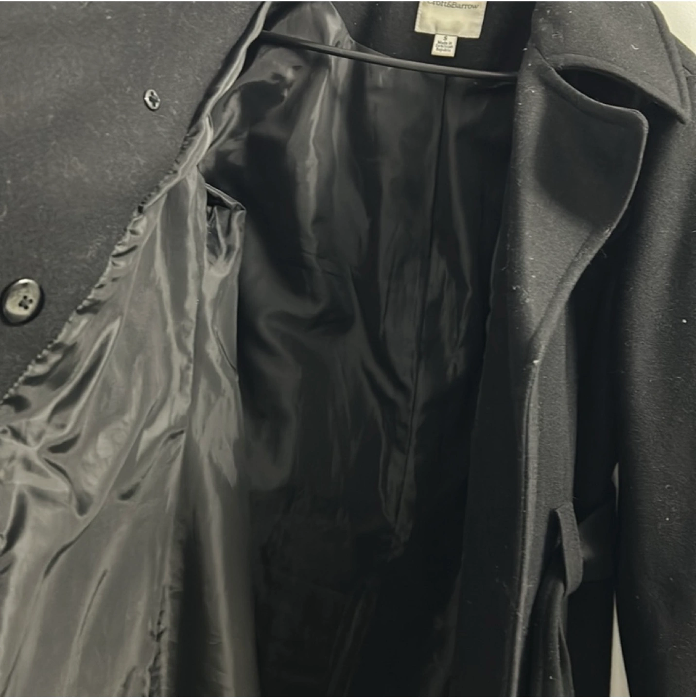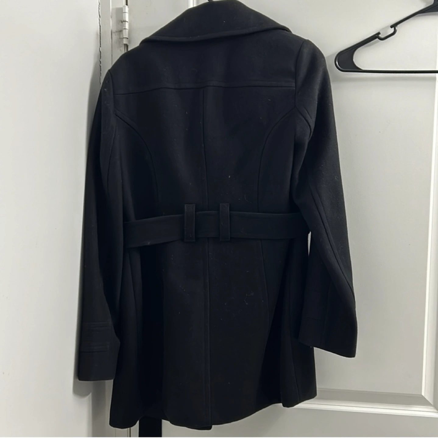Croft and Barrow black wool blend peacoat in black. Has a tie belt and ends right above the knee (I’m 5’6). Lightly used but in great condition. Double breasted. Size Small.