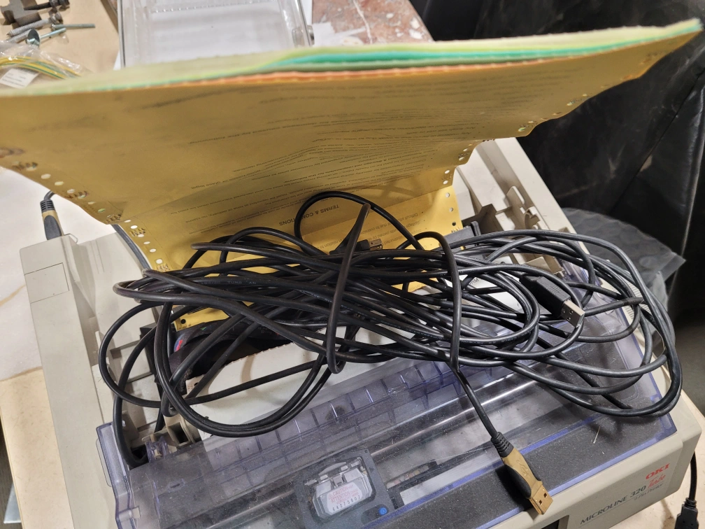 dot matrix printer, used but in good condition. Includes a USB cable.