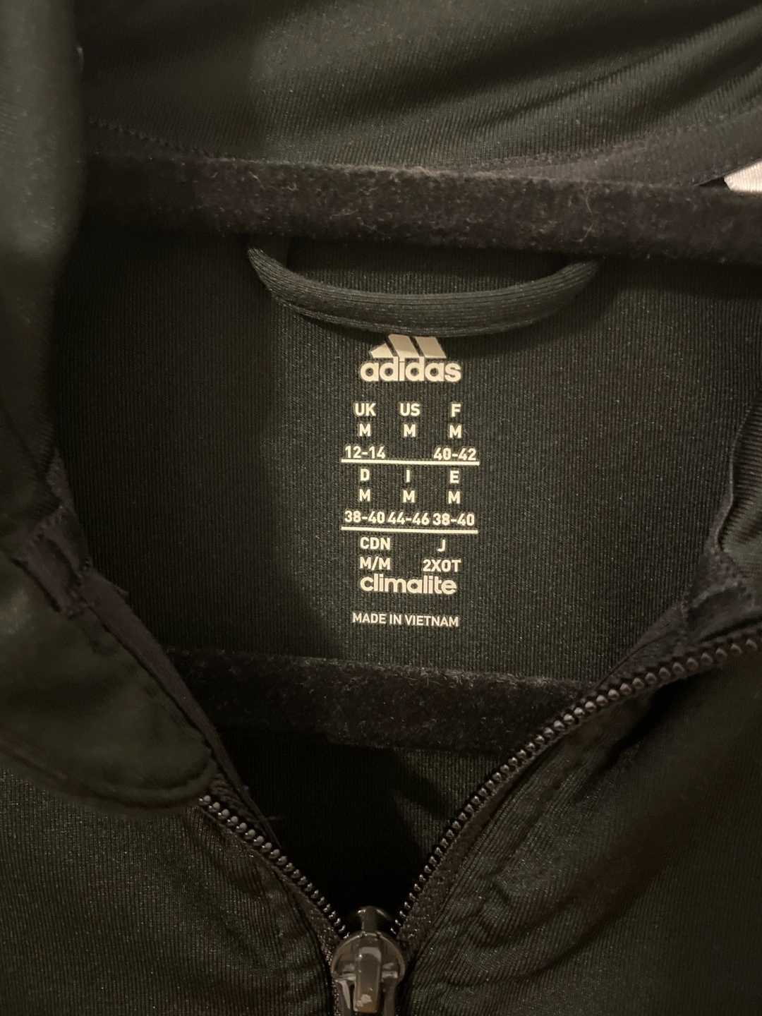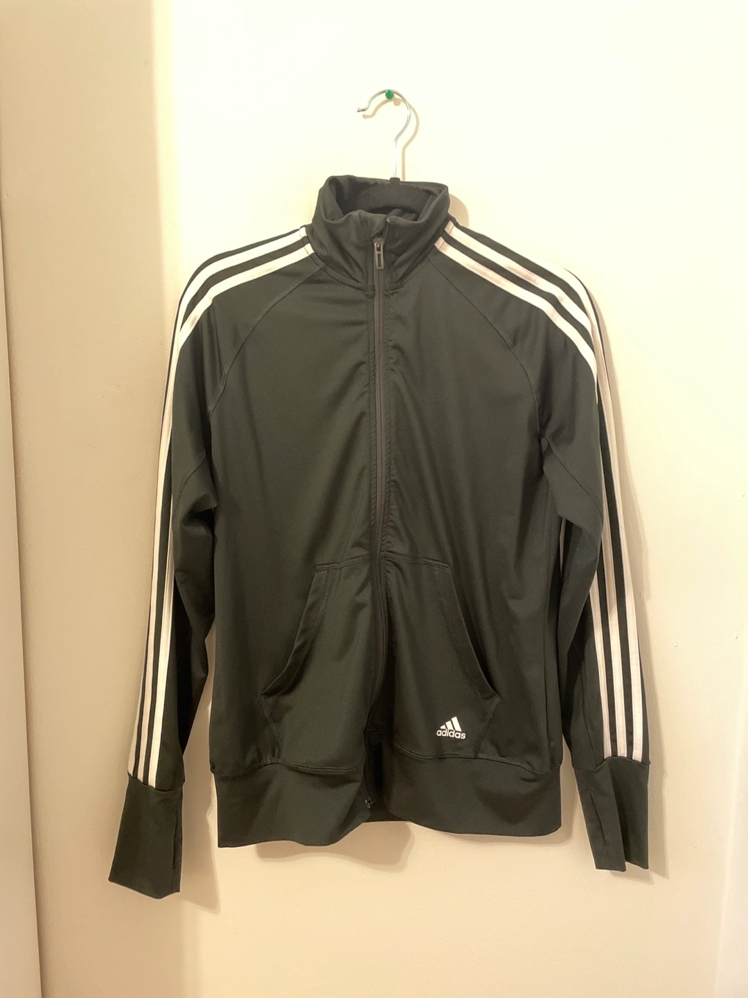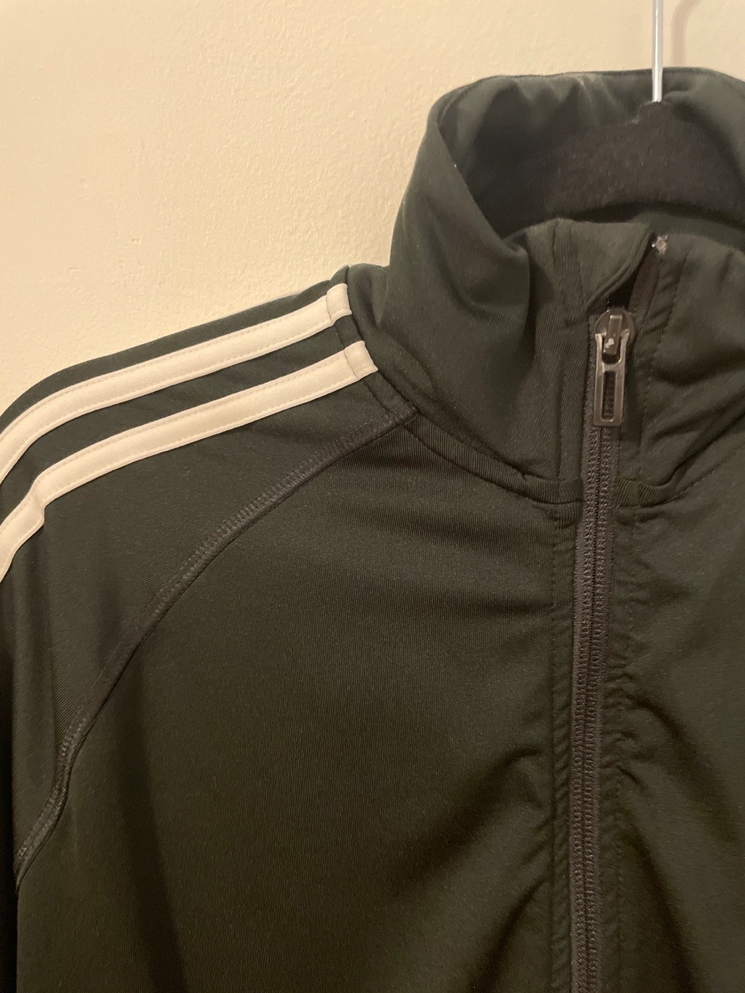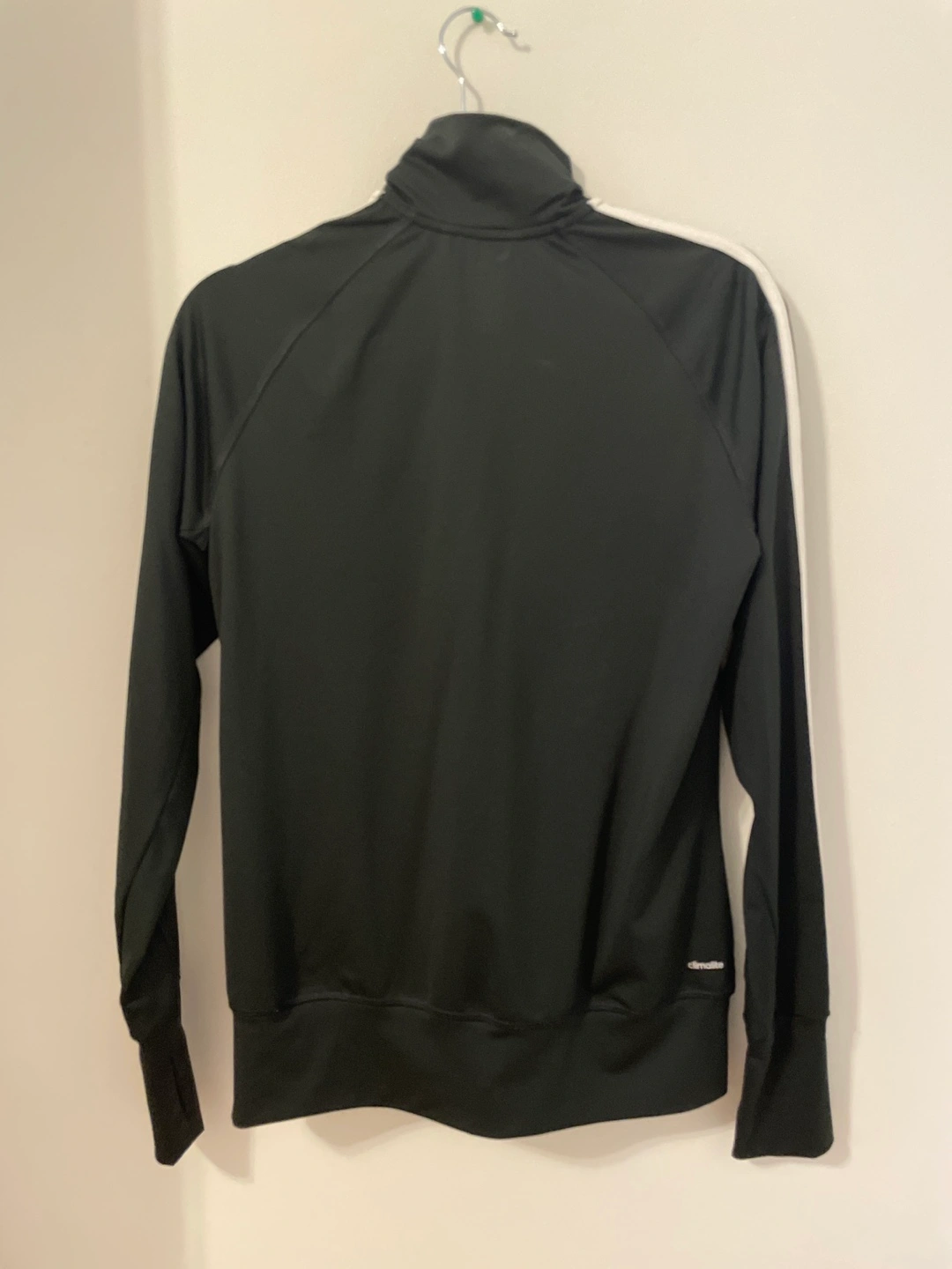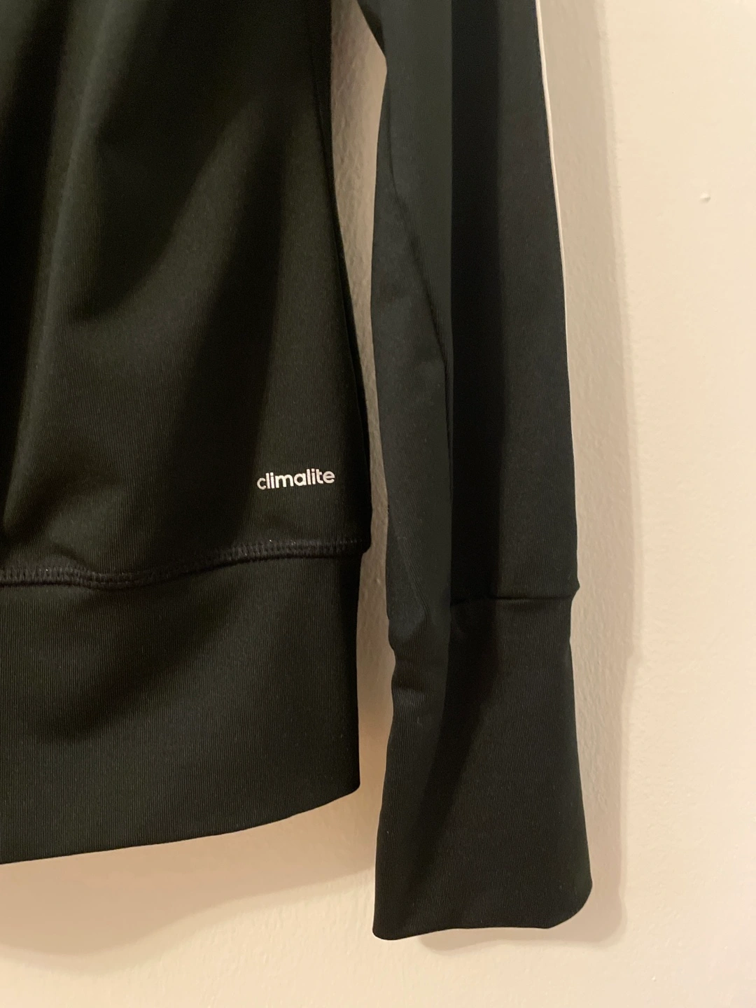 Adidas black track jacket with white stripes on the sleeves. Zip up closure. ClimaLite technology.