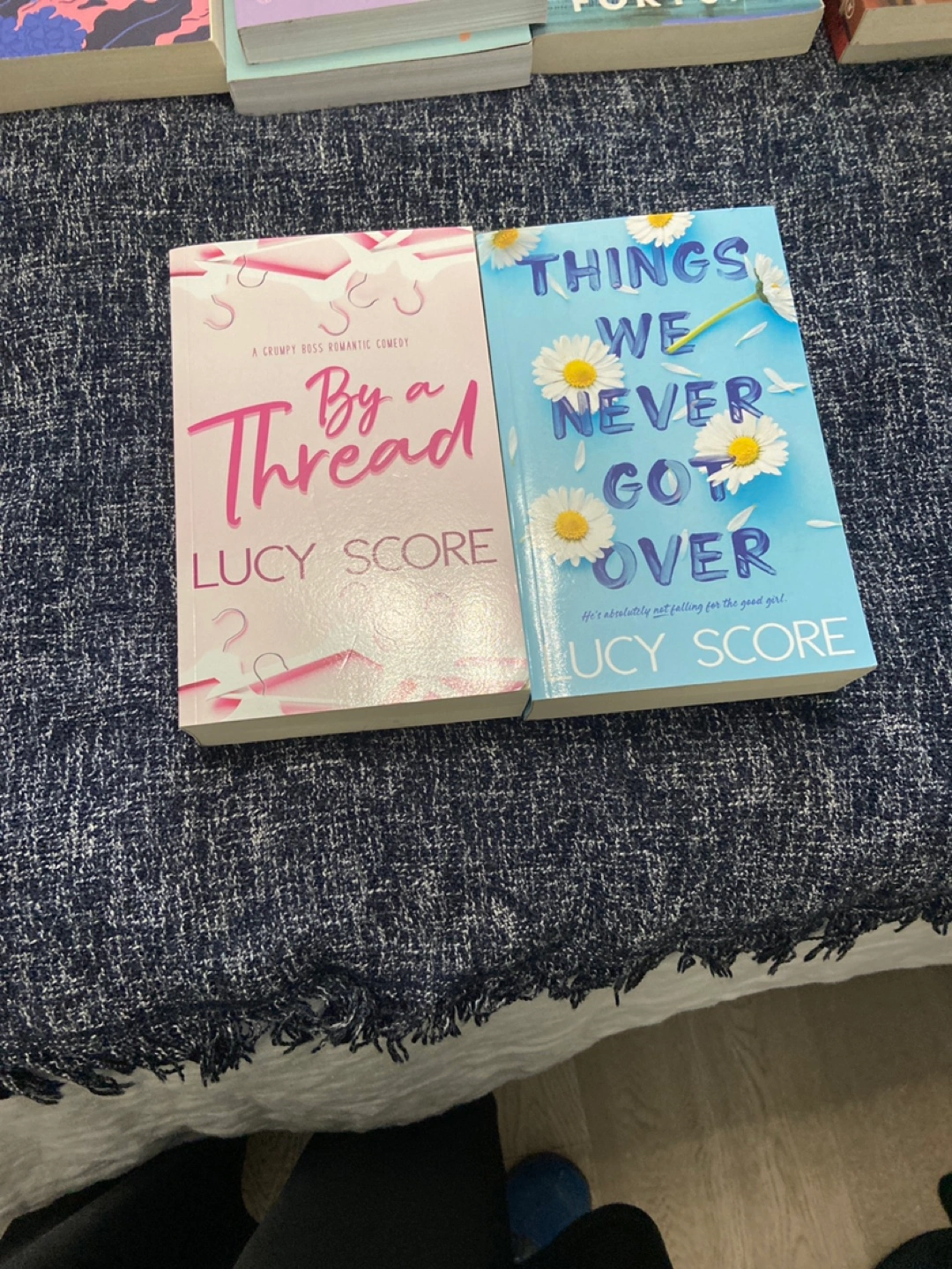 Two paperback novels by Lucy Score. One is titled By a Thread and the other is titled Things We Never Got Over. New 10.00 each