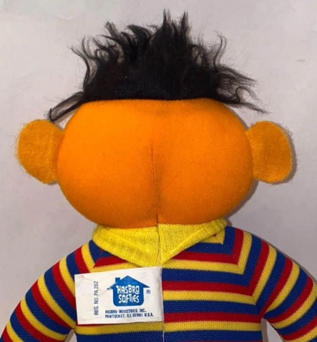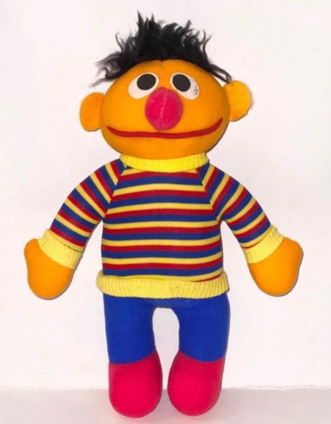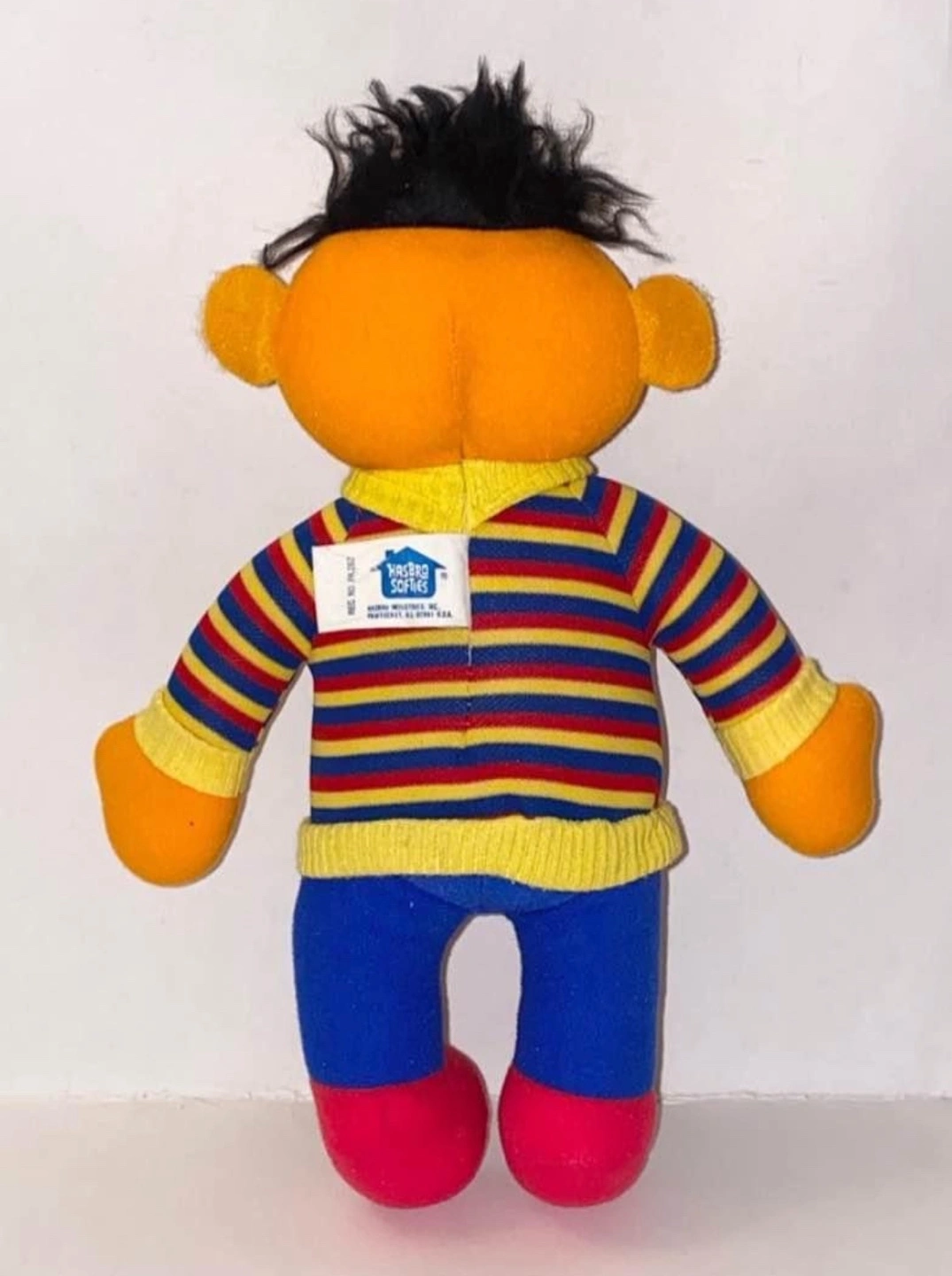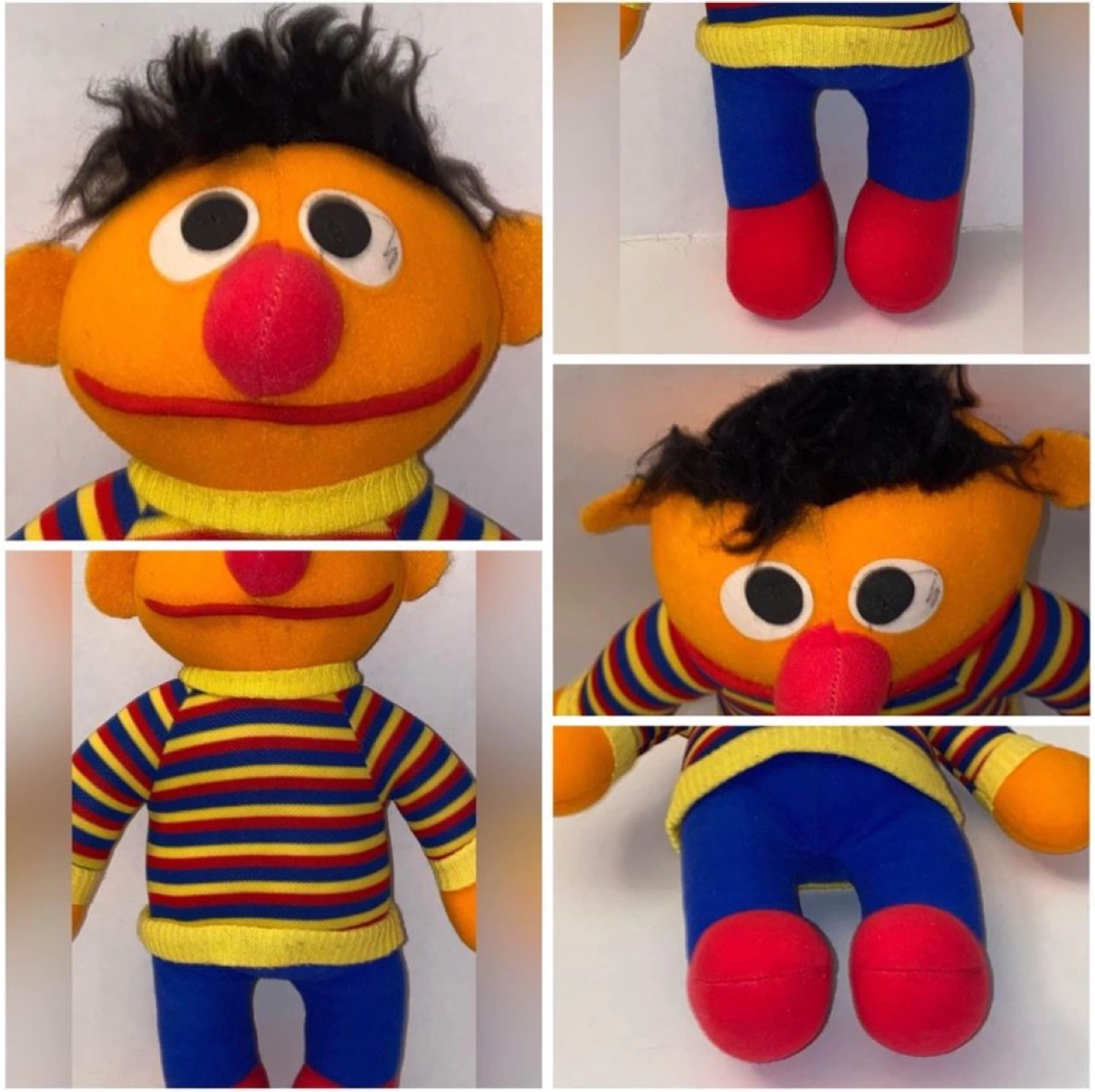 Vintage Sesame Street Ernie plush doll. Wearing a yellow, red, and blue striped sweater and blue pants. Has some staining; please view pictures.