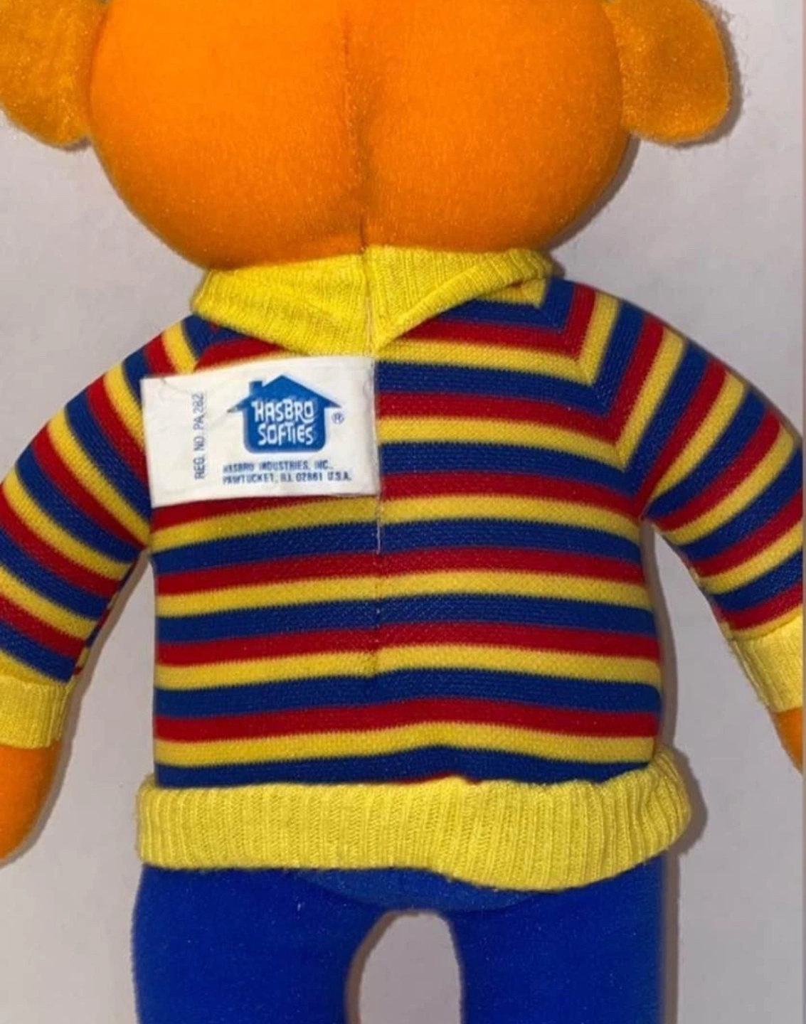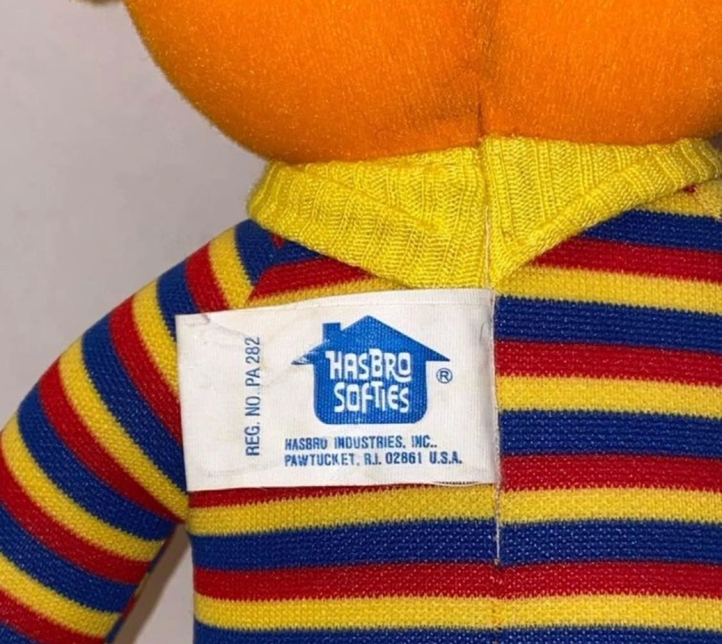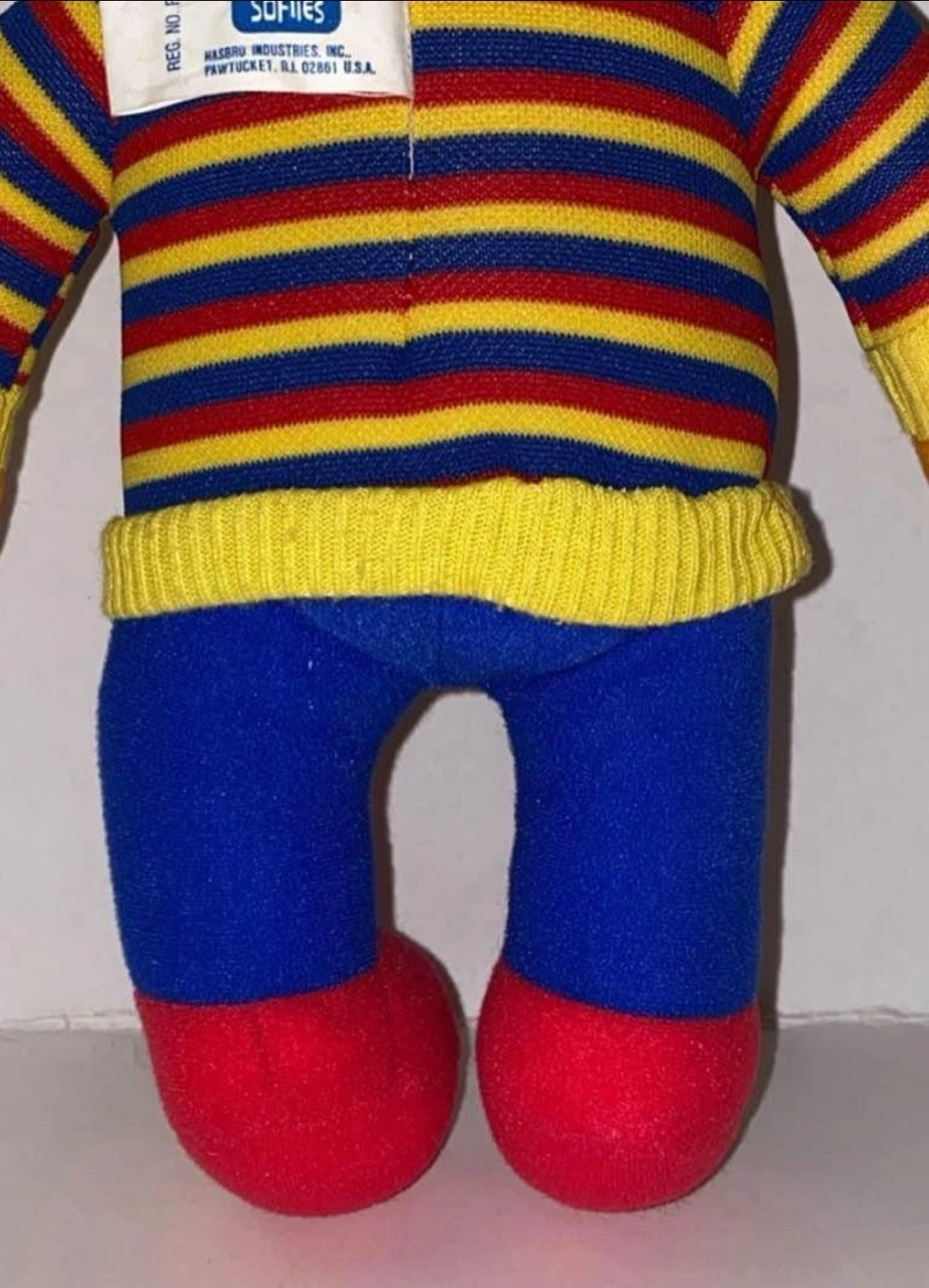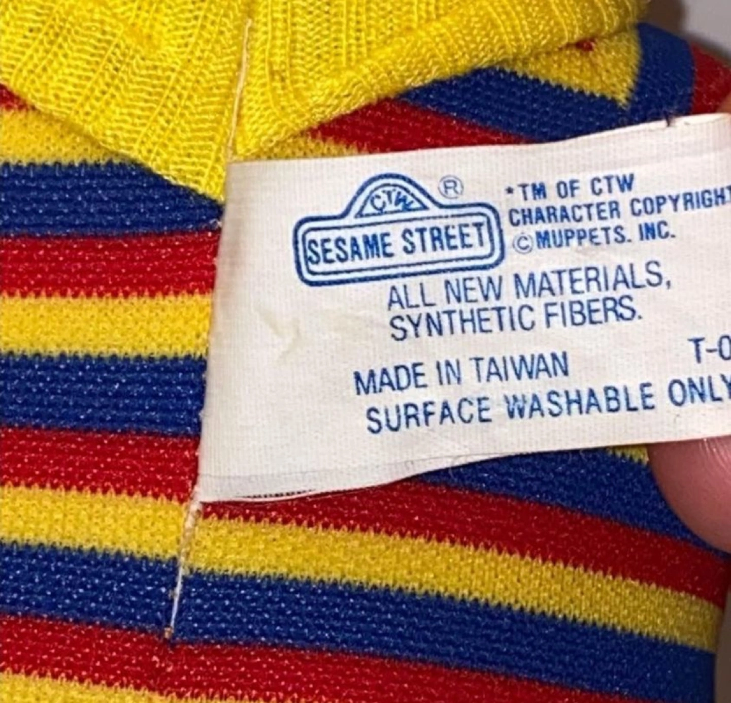 Vintage Sesame Street Ernie plush doll. Wearing a yellow, red, and blue striped sweater and blue pants. Has some staining; please view pictures.