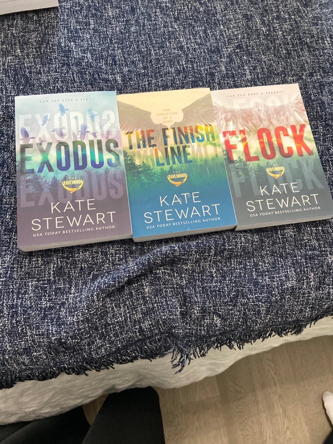 Set of three books in the Ravenhood series. The books are: Exodus, The Finish Line, and Flock. All books are by author Kate Stewart. The books are new.