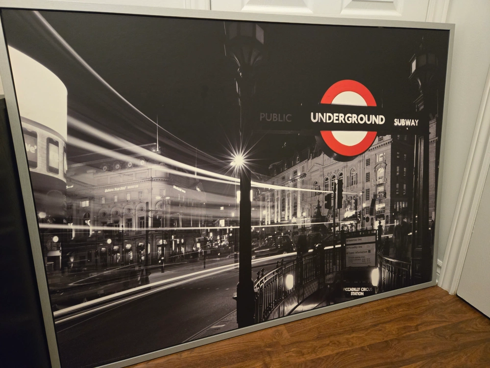 Large framed print of the London Underground, black and white photo with a silver frame. Includes hanging wire. A bit dusty but otherwise great condition. Pick up Only