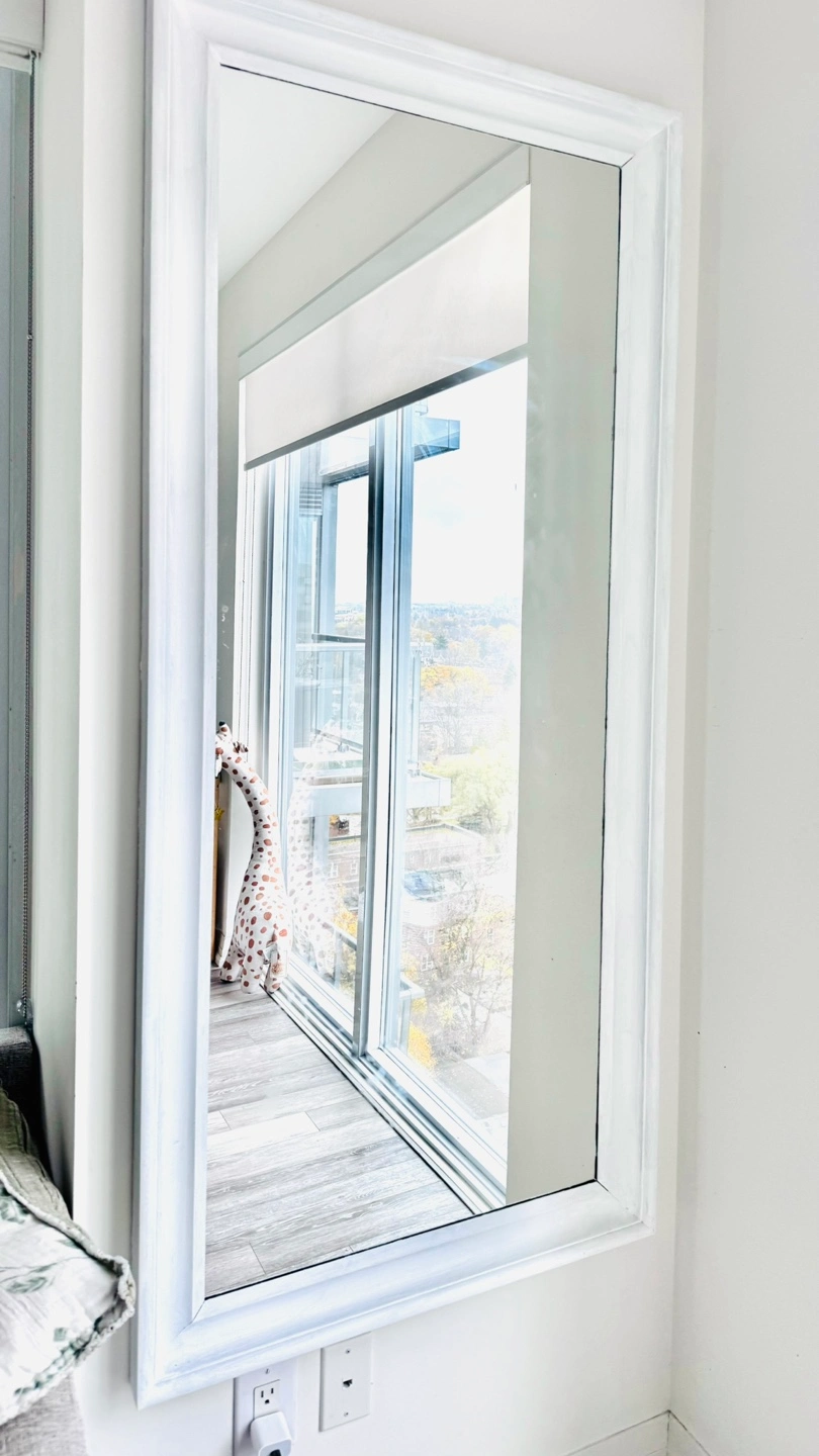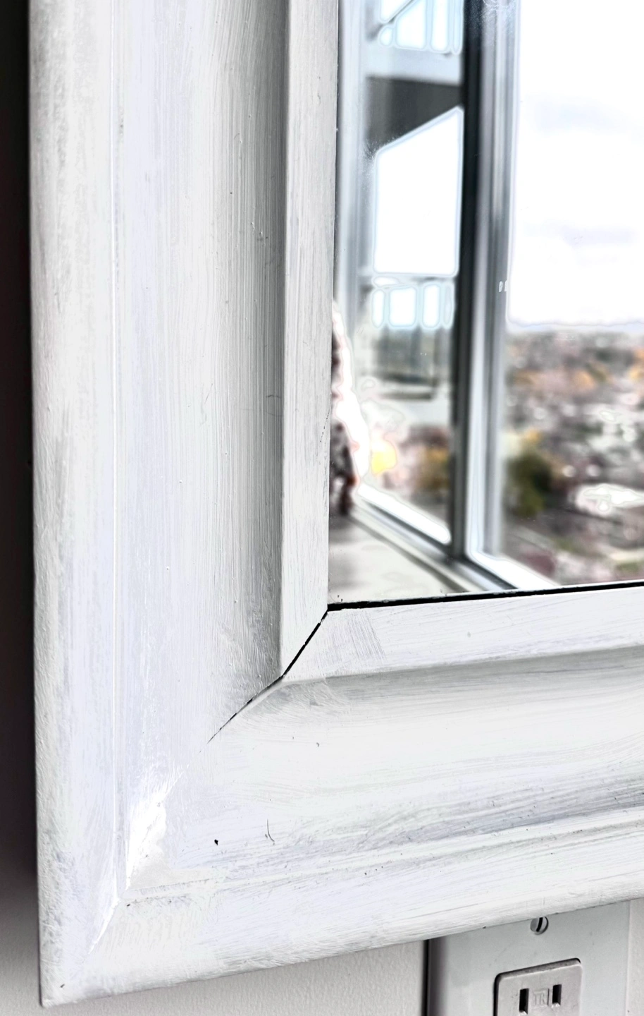 Large mirror with rustic painted white frame. Very good condition. Can be hung or placed on the floor.