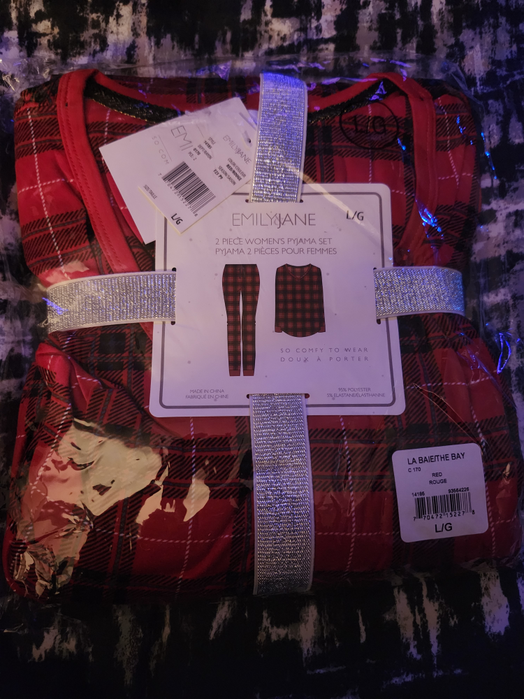 2-piece pajama set, includes top and pants. Red plaid pattern. Brand new in package with tags on.