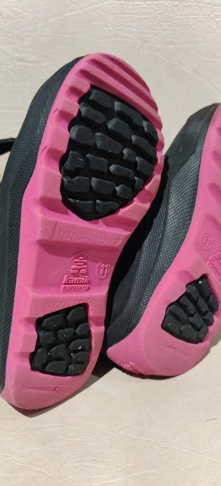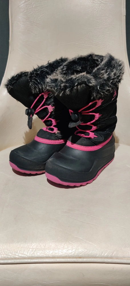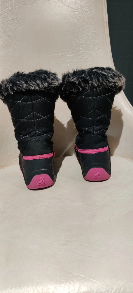 Black Kamik winter boots with pink accents and fur trim. Lace-up closure. Like new condition used 1 season. Pet free, smoke free clean home.