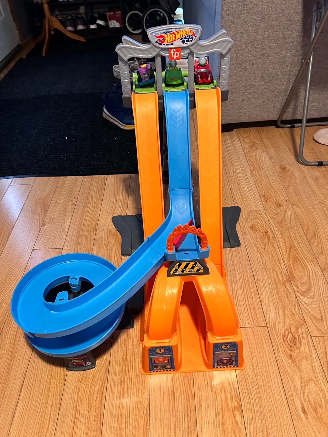 Hot Wheels Loops Tower Race Track with Stunt Ramp & Sounds. Includes three cars instead of two. Used, but in excellent condition. Only had it for a few months and barely played with.