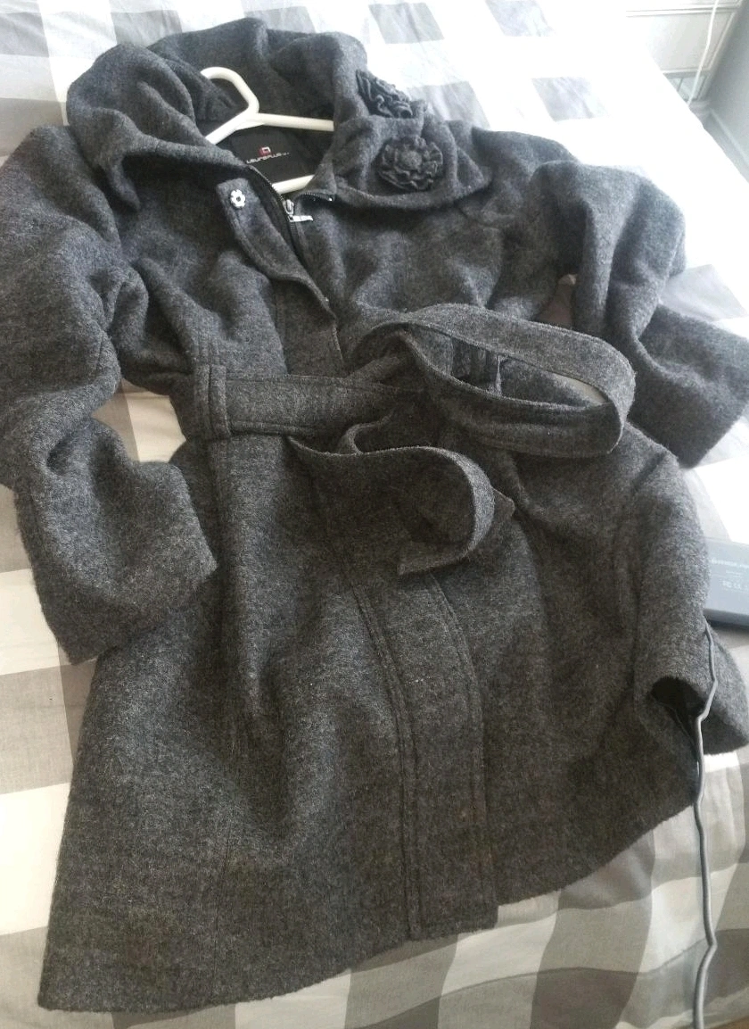 113Grey wool coat with a hood, belt, and flower embellishments on collar. Lined, wool, snaps, and zipper closure for extra warmth and style. Worn twice.