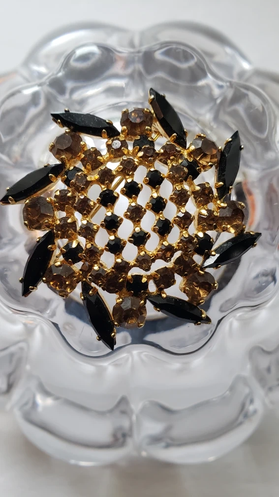 188Black and brown rhinestone brooch. Gold tone setting. Approximately 2 inches in diameter.