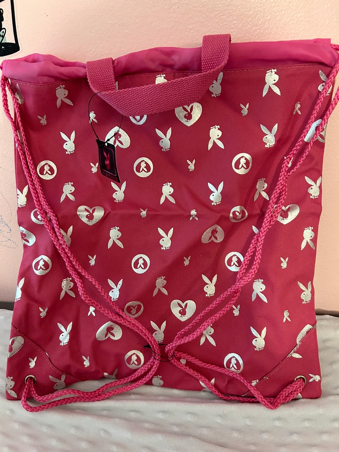 321Pink drawstring bag with Playboy bunny logo pattern. Has two shoulder straps and a drawstring closure. New with tags.