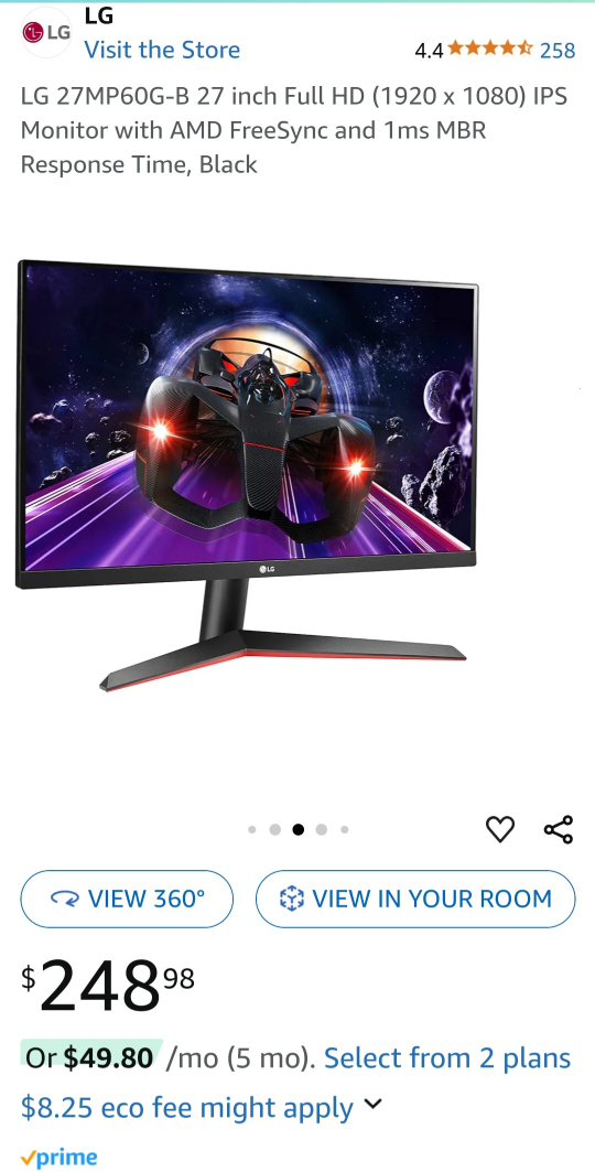 LG 27MP60G-B Monitor. FHD (1920 x1080) IPS monitor. Has AMD Free sync, and 1ms MBR response time functionality.