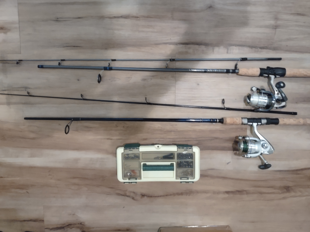 Two Fishing rod and reel combo. Includes a tackle box with various fishing gear. Used once, Comes with a line. moving out, I need the money!