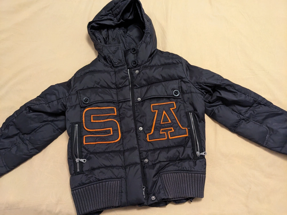 525Black puffer jacket with orange 'SA' lettering on the front with a hood. Features zipper and button closure. Has several pockets. Would fit size small/xsmall well.