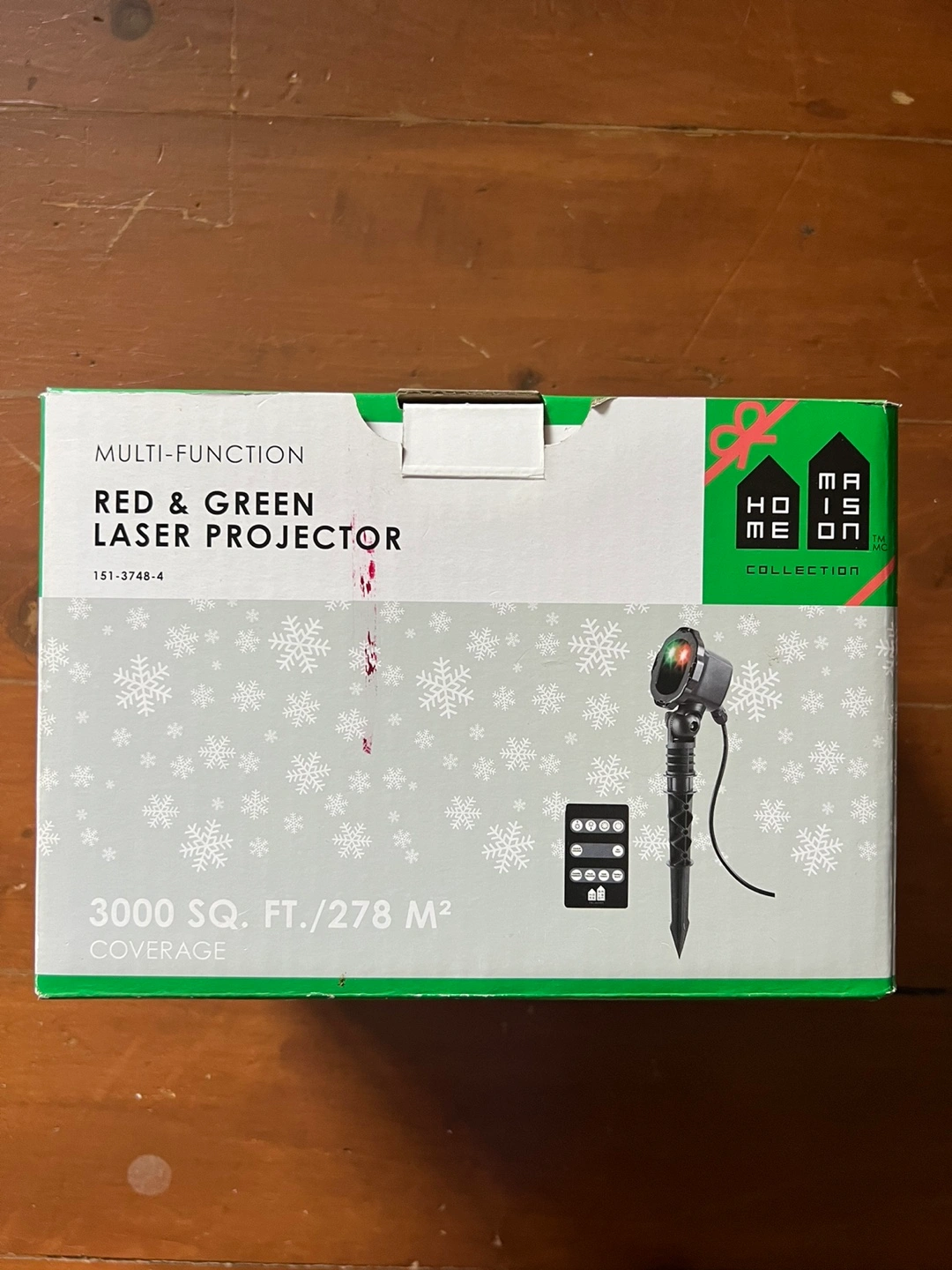 Multi-function red and green laser projector with remote control. 3000 sq ft coverage.