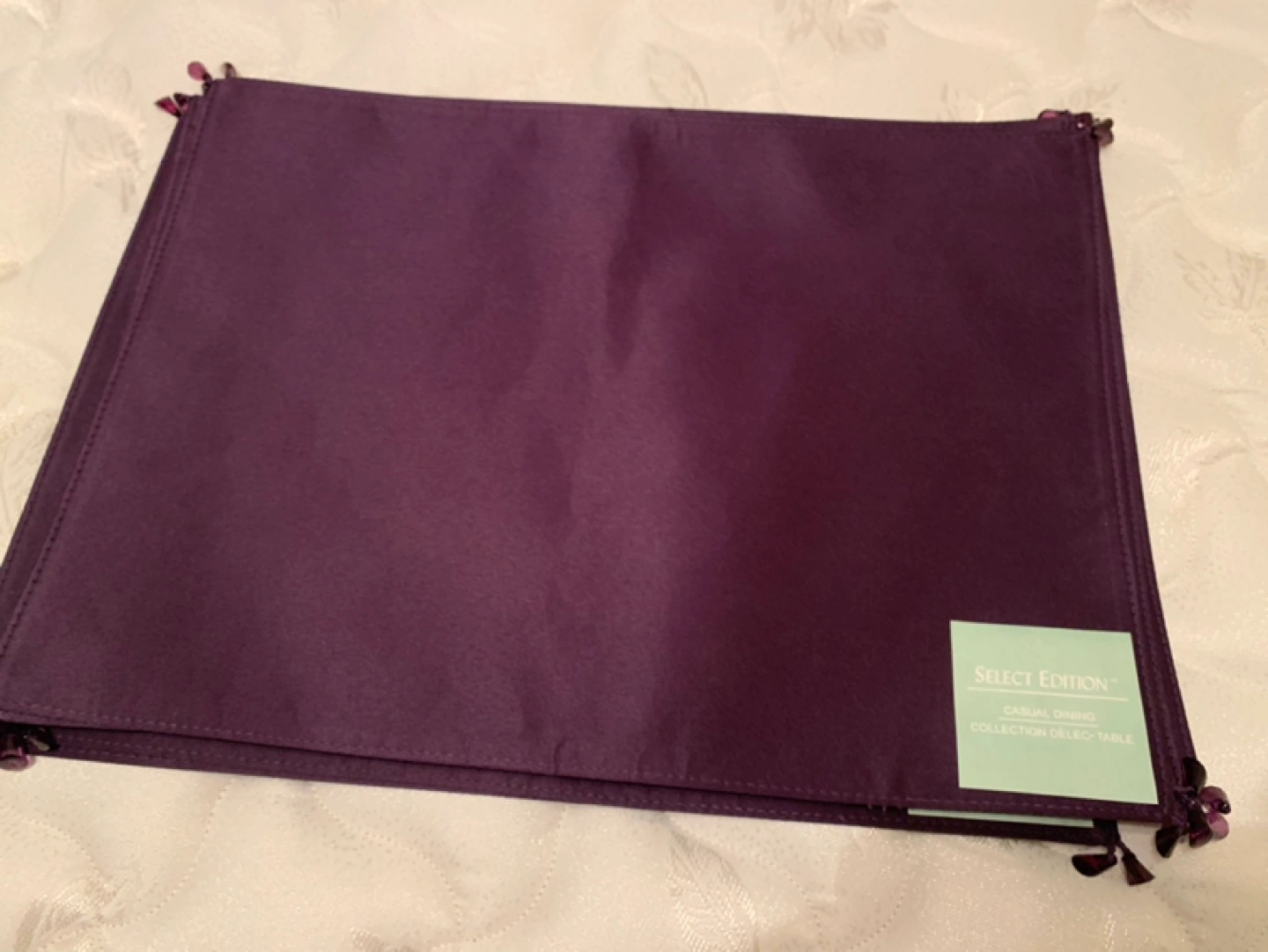 New Set of eight purple satin placemats with beaded tassels. 100% polyester.