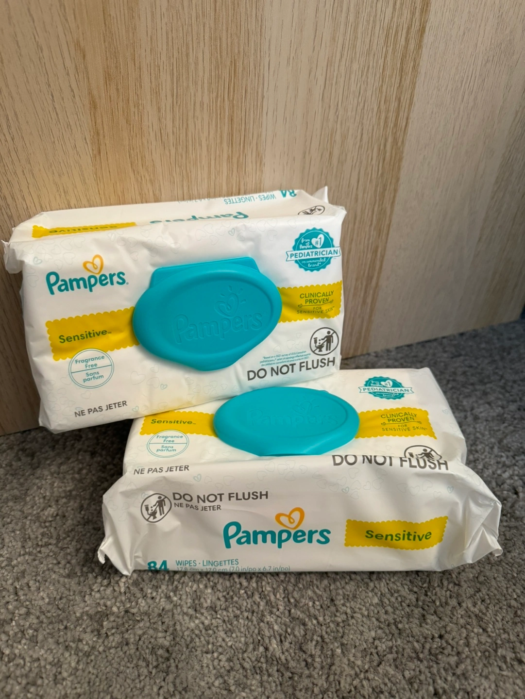 Pampers Sensitive baby wipes, fragrance-free, clinically proven for sensitive skin. Do not flush.