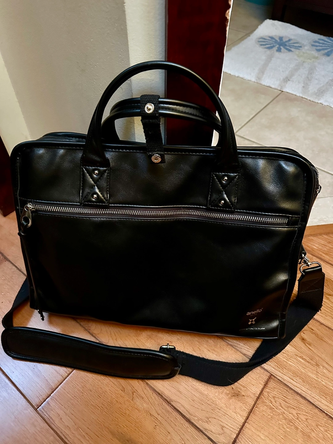 Black briefcase with a long adjustable shoulder strap and two top handles. Fits a laptop and more. Has a zippered top closure. Fabrication is a Synthetic leather