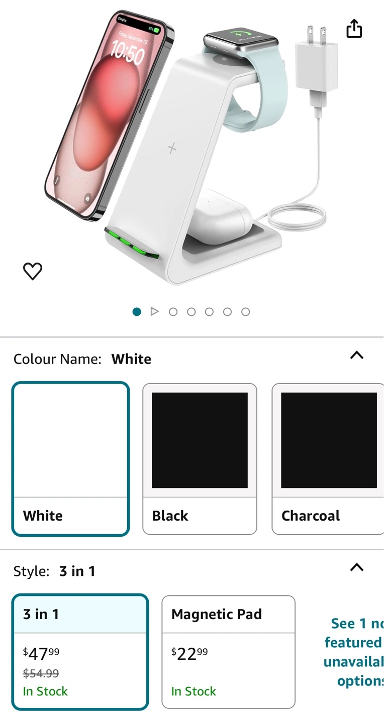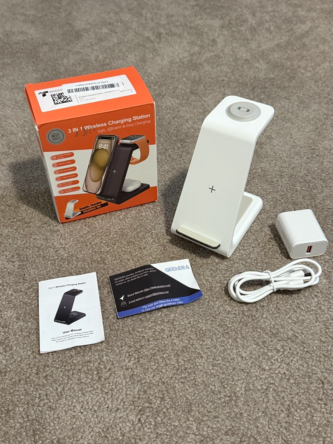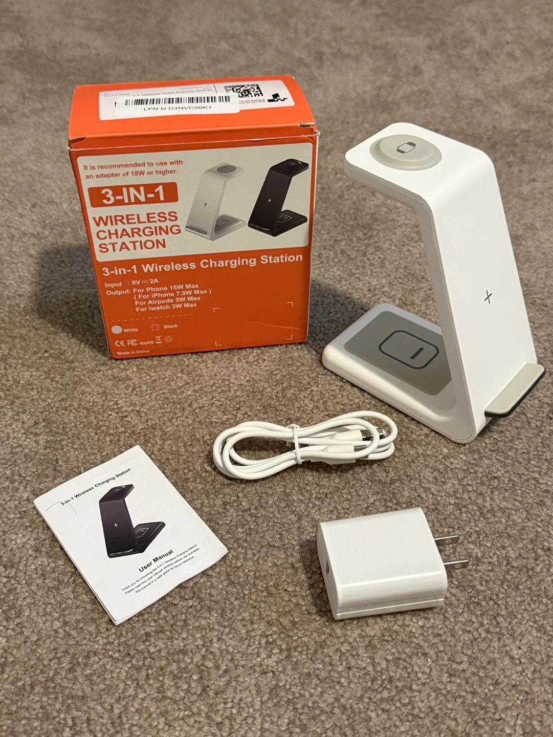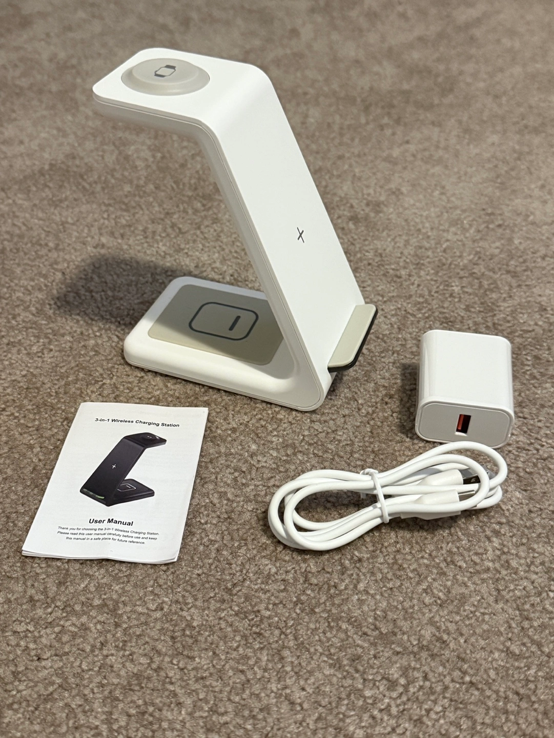 3-in-1 wireless charging station. Charges phone, watch, and AirPods. Includes cable and adapter. Still brand new, everything is fully function and in mint condition.