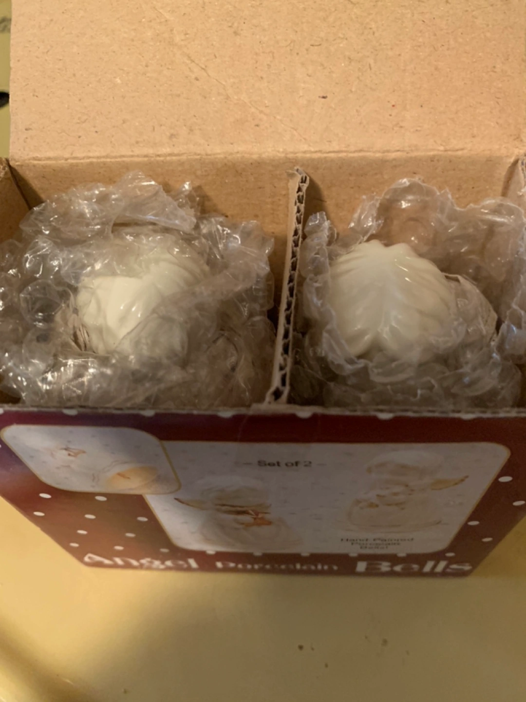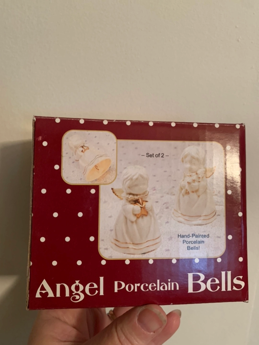 Set of two hand-painted porcelain bells, each featuring a different angel with a gold star. New in box -never used