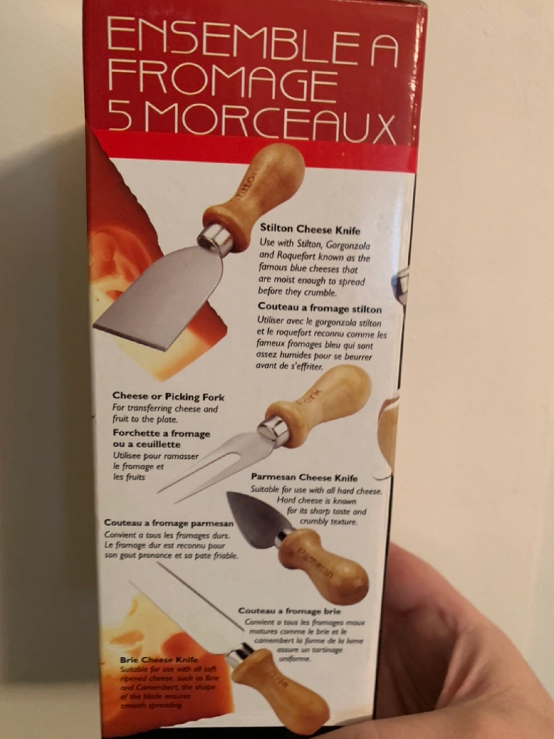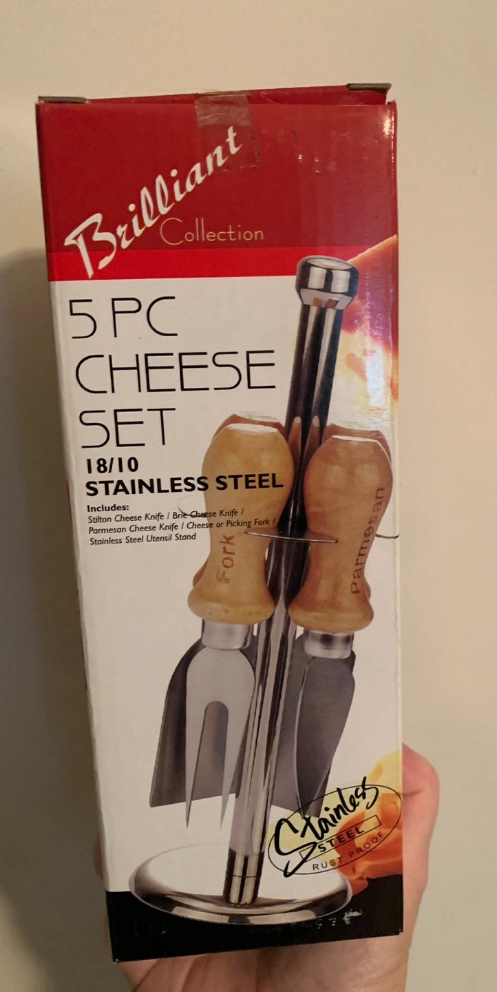 Includes Stilton, Brie, Parmesan, and cheese fork knives. Comes with a stainless steel utensil stand.