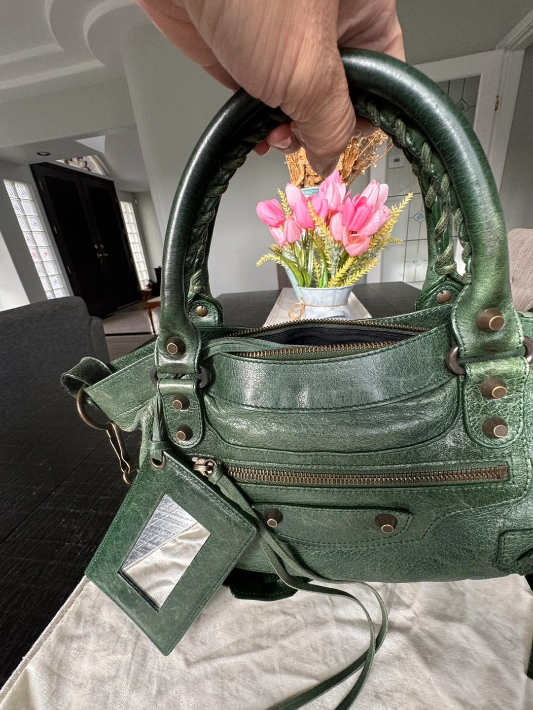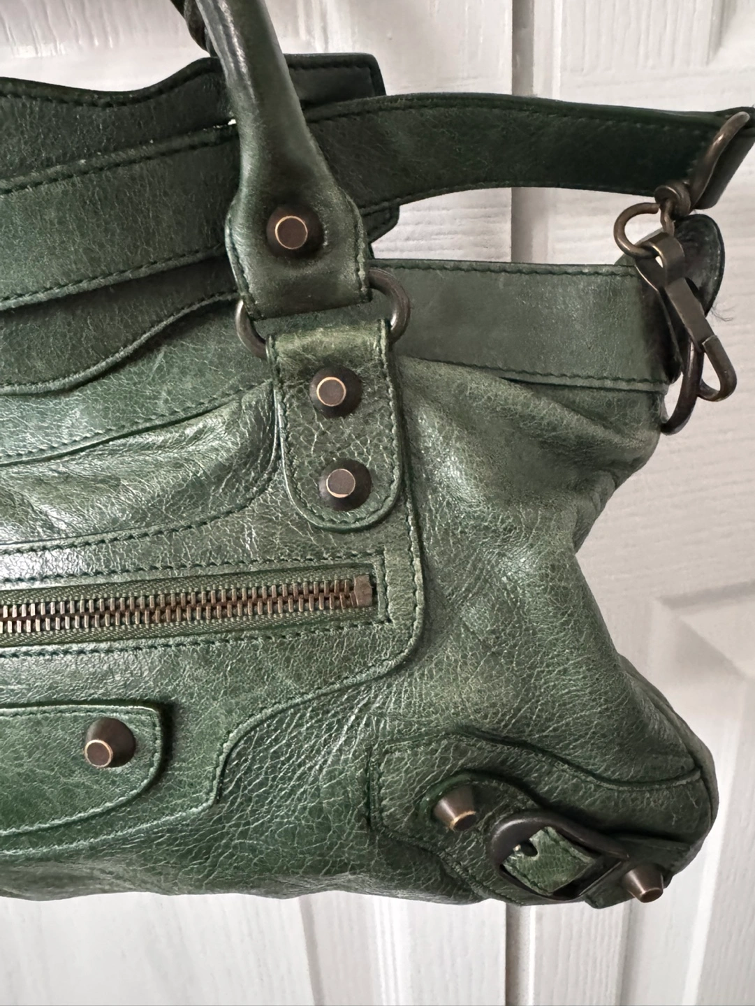 Green leather bag with black hardware. Comes with a dust bag and a shoulder strap. Shows some wear and tear.
