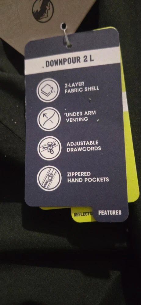 Selling a brand new with tags Wind River Downpour 2L jacket in size small and black. This jacket features a 2-layer fabric shell, under arm venting, adjustable drawcords, and zippered hand pockets. It also has Reflectshun reflective material for enhanced visibility. I bought this for $99.99