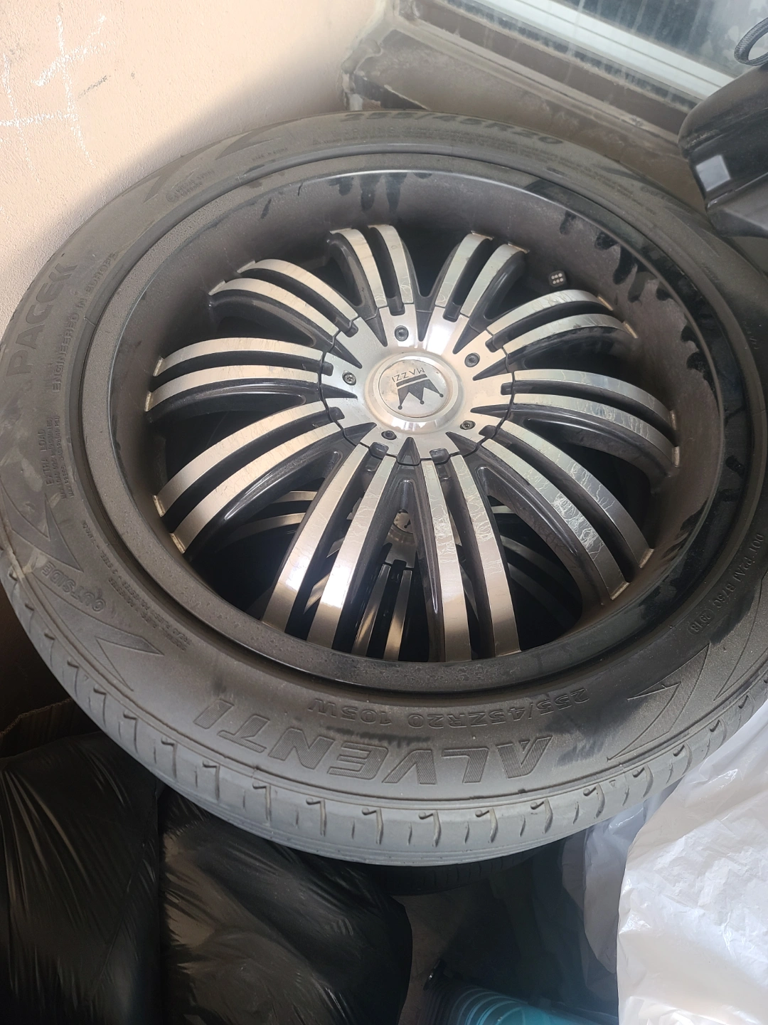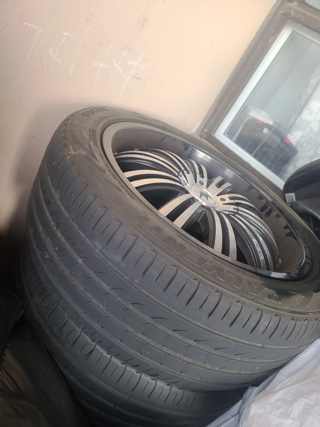 Set of four 20 inch KMC rims with tires. Good condition. Black and silver multi-spoke design. Used, but in good shape.