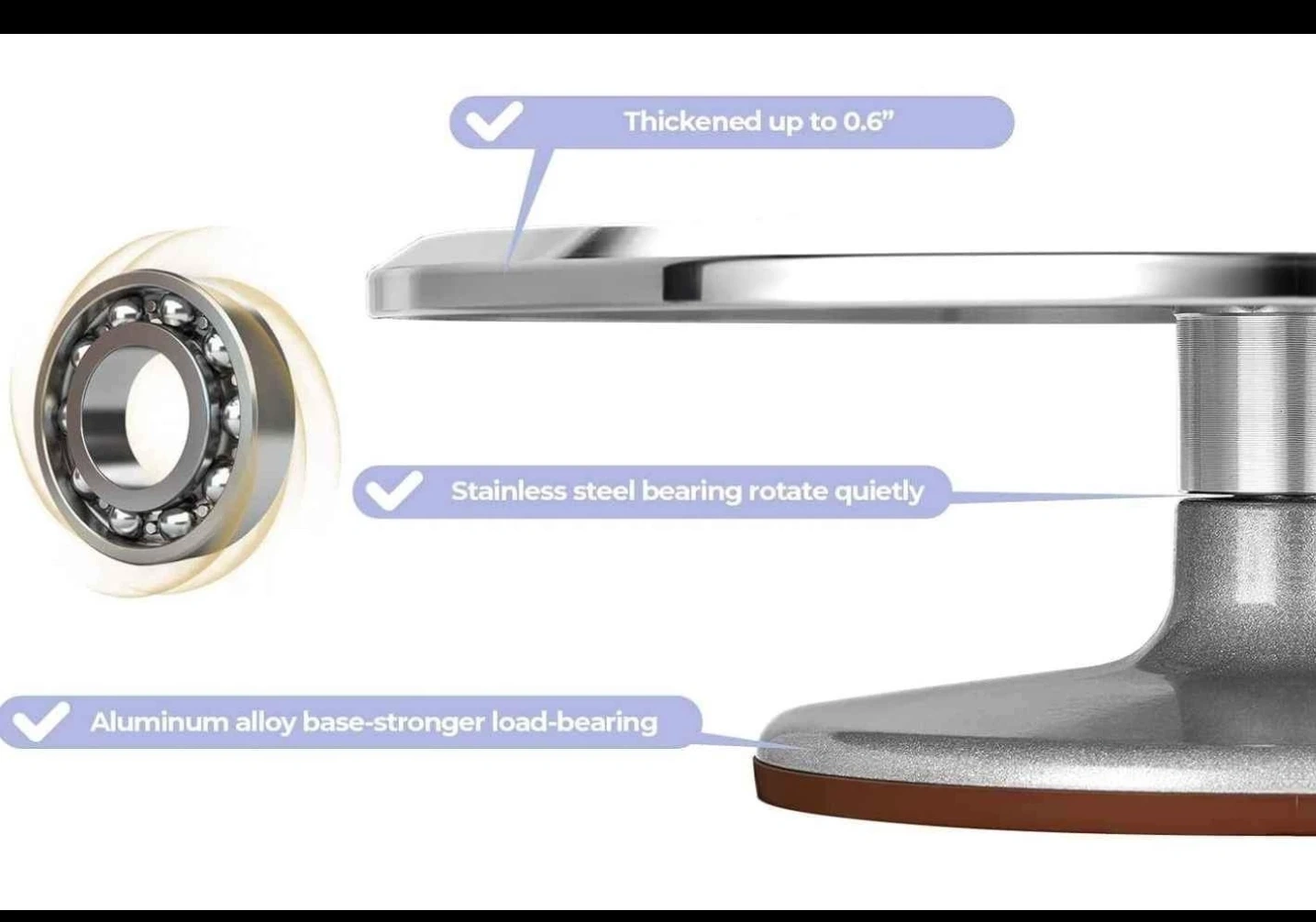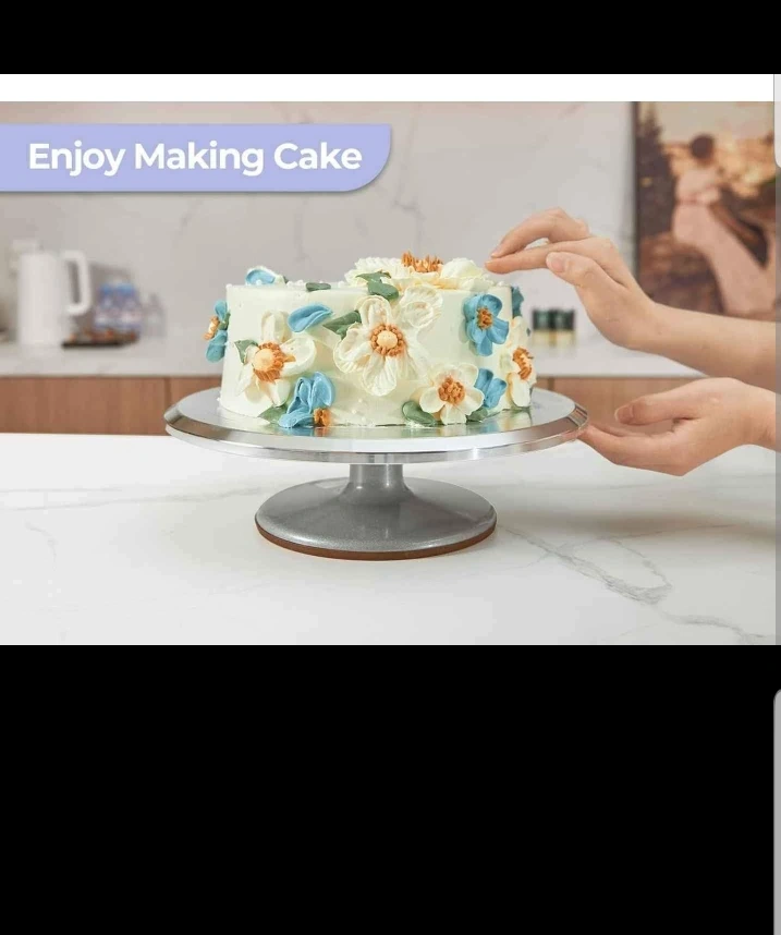 Rotating cake stand with a non-slip silicone base. Features a stainless steel bearing and an aluminum alloy base. 12inch heavy duty cake turnable.