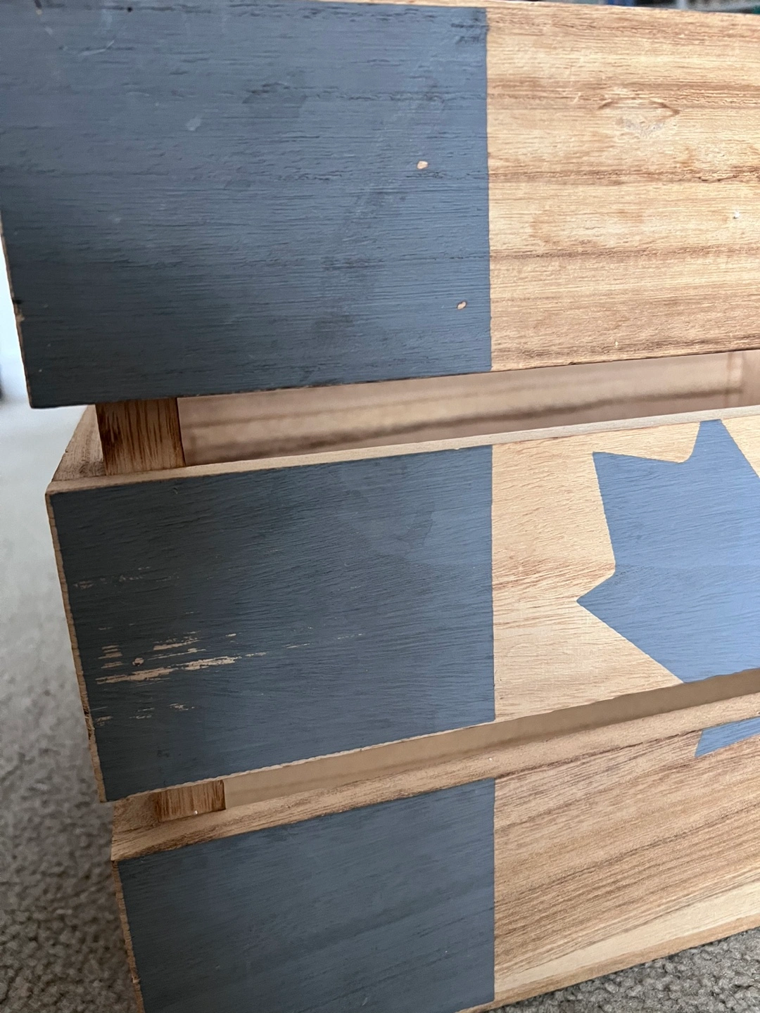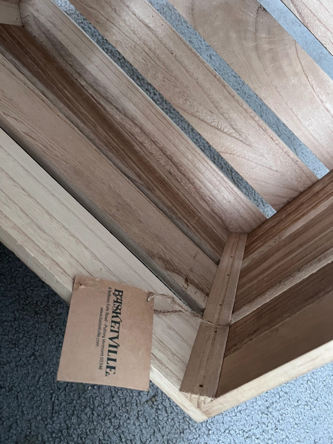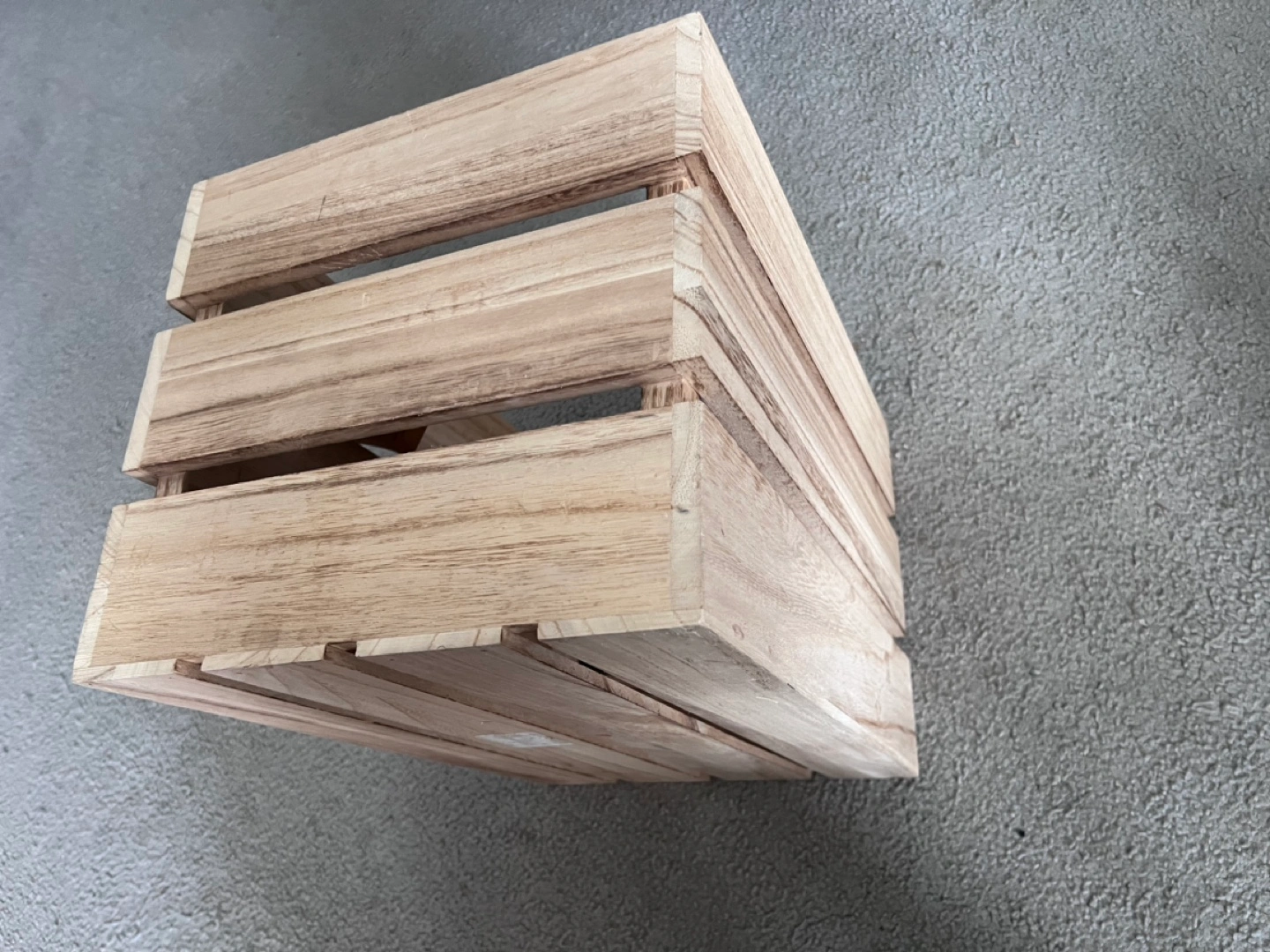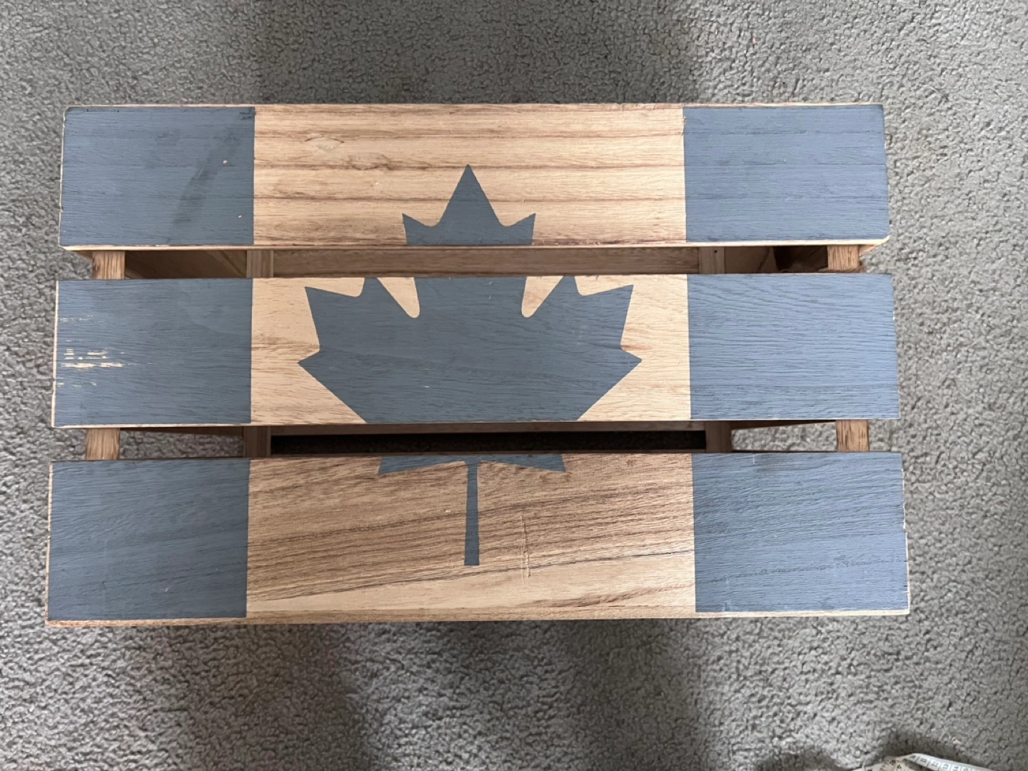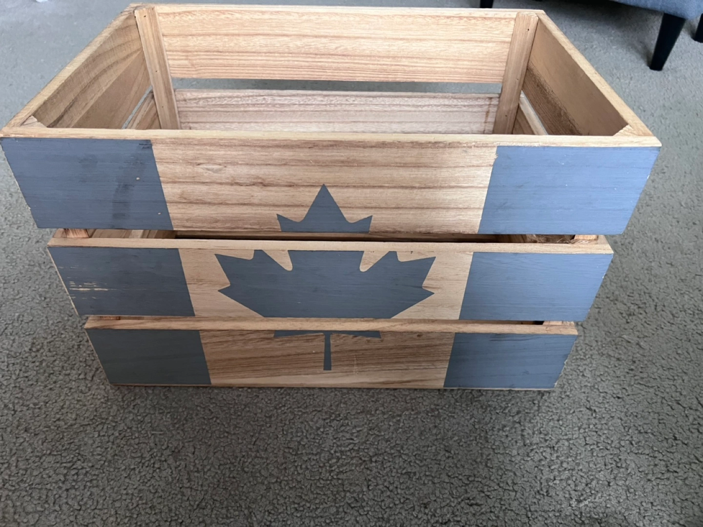 Wooden apple like crate in natural wood colour with a gray Canadian Flag print on the front side.