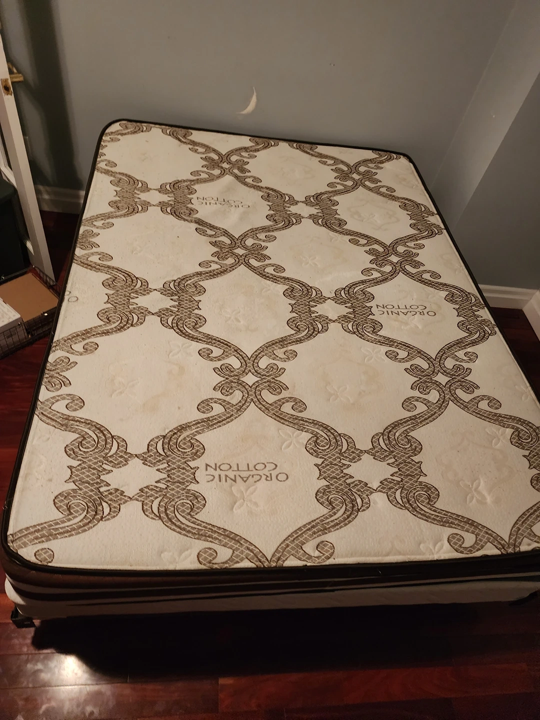 Almost 2 years old, "organic cotton" firm mattress. rotated regularly, sone minor pilling. includes basic frame.